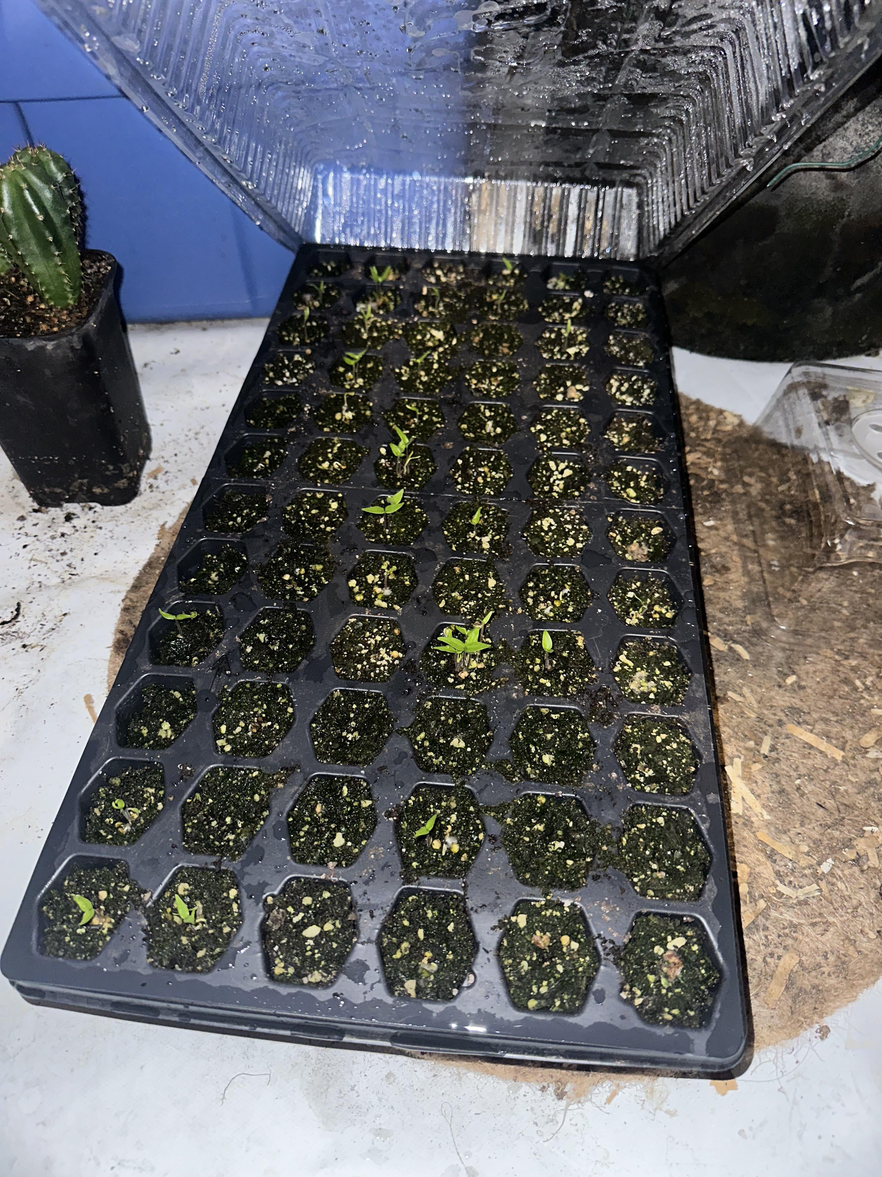 cali reapers, jay’s white ghost scorp, chocolate trinidad scorp, super bhut jolokia, jamaican scotch bonnet, seven pot primo, chocolate primotalii, 7 pot brain strain. Seeds got mixed so they all went into the big tray.