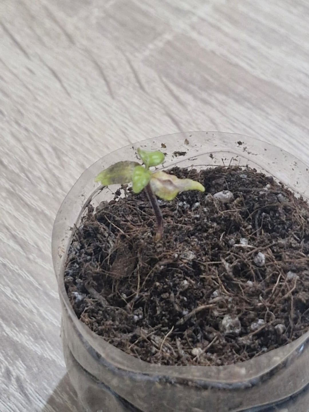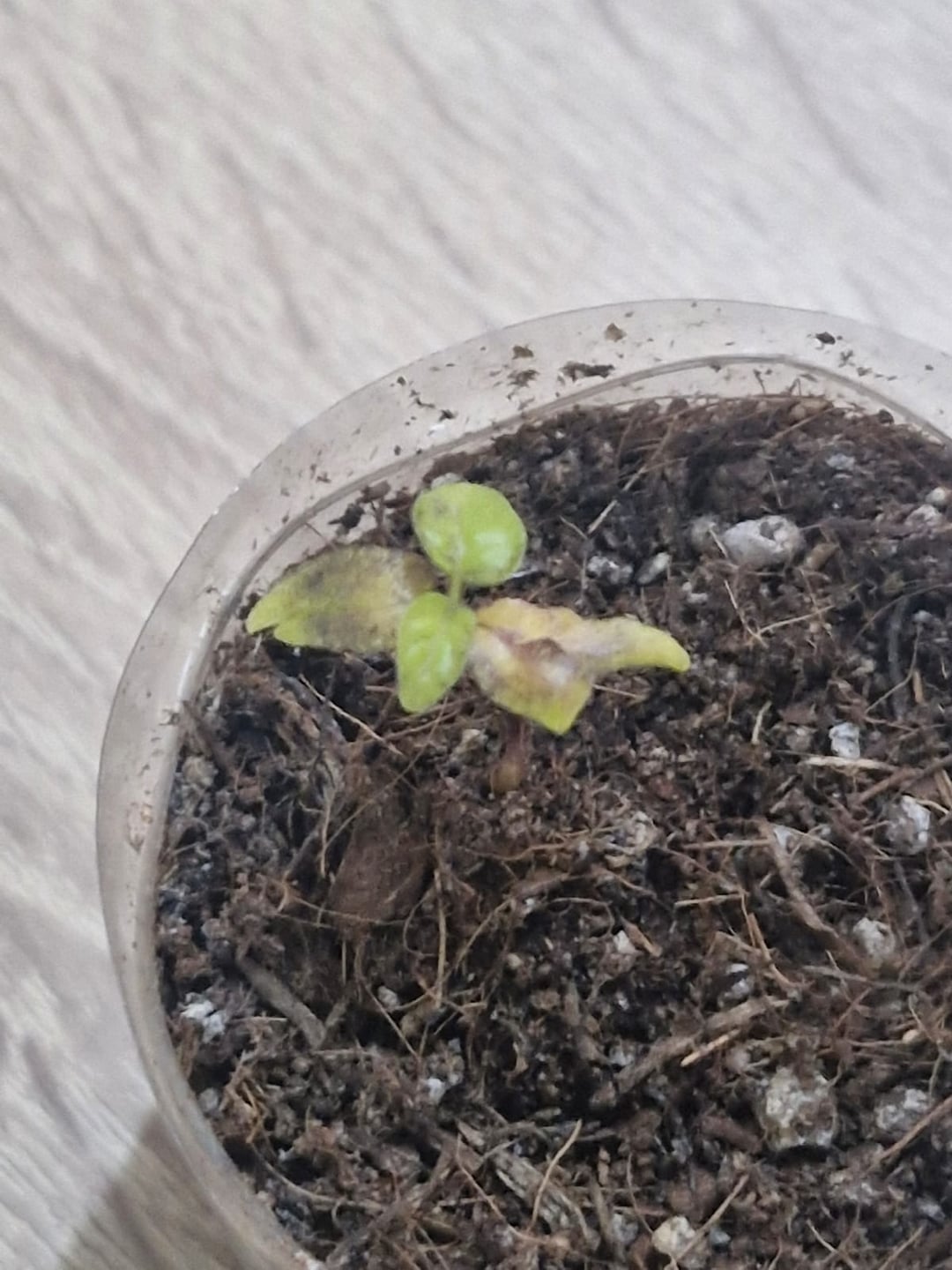 Hello, this seedling germinated about a month ago. The first true leaves grew just in time and beatutfully but havent grown a inch since. Conditions are literally same i even put somewhere warmer just to boost growing still staying same as before. Cotyledons started yellowing i know its normal in this time period but 0 movement from new true leave formation. Any idea? I also water only when top layer dries out so i dont think its from ovrewatering