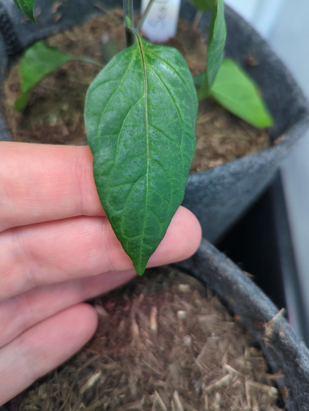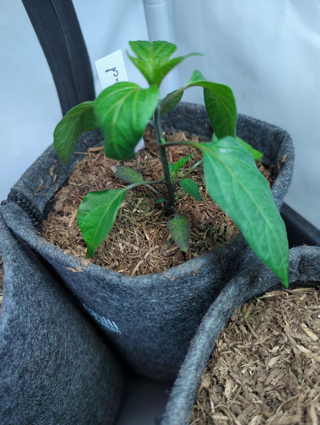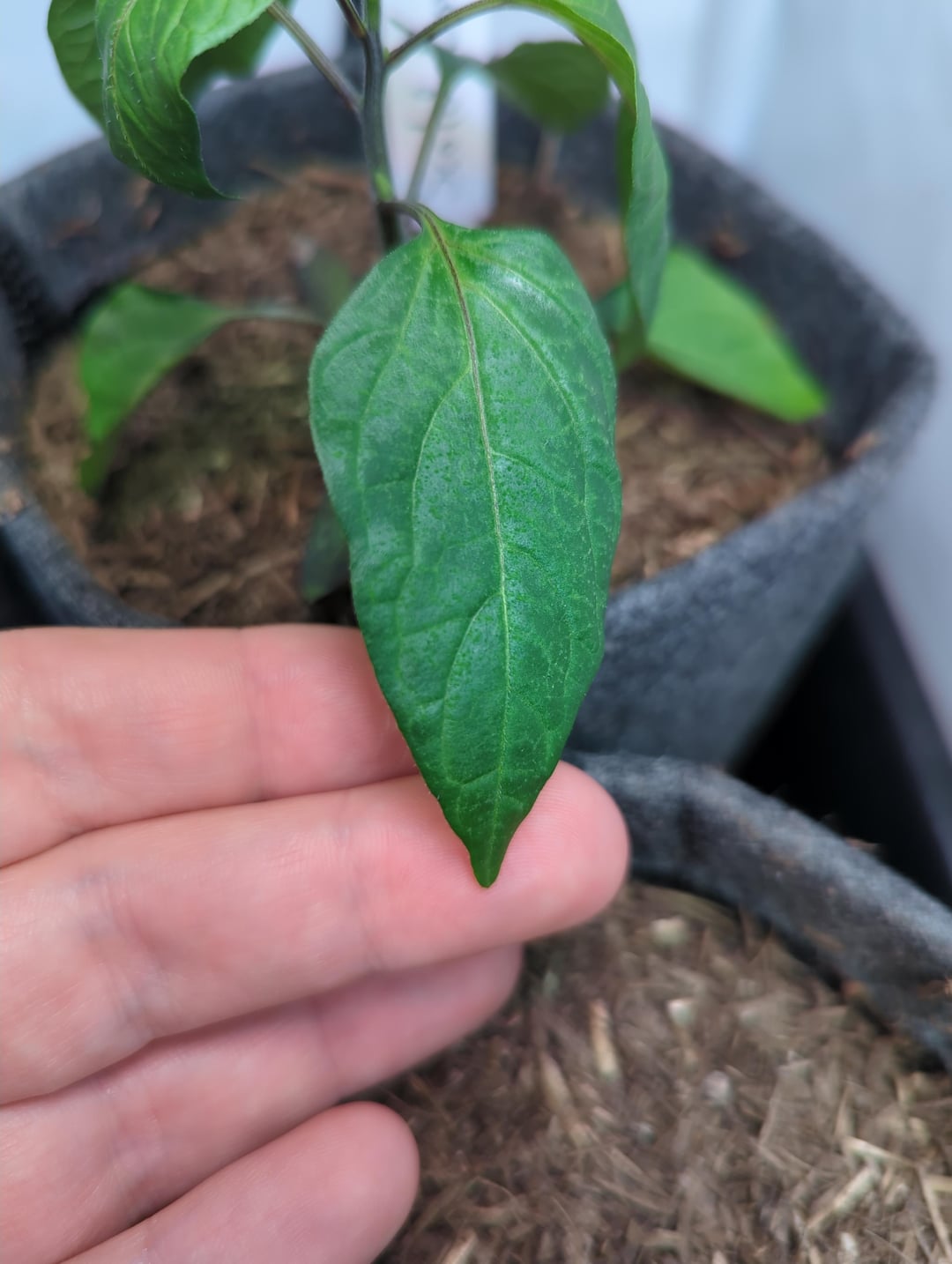 This is my tallest and best-looking pepper at the moment, but things seem to be going south: leaves are starting to curl, and there are whitish spots on them.