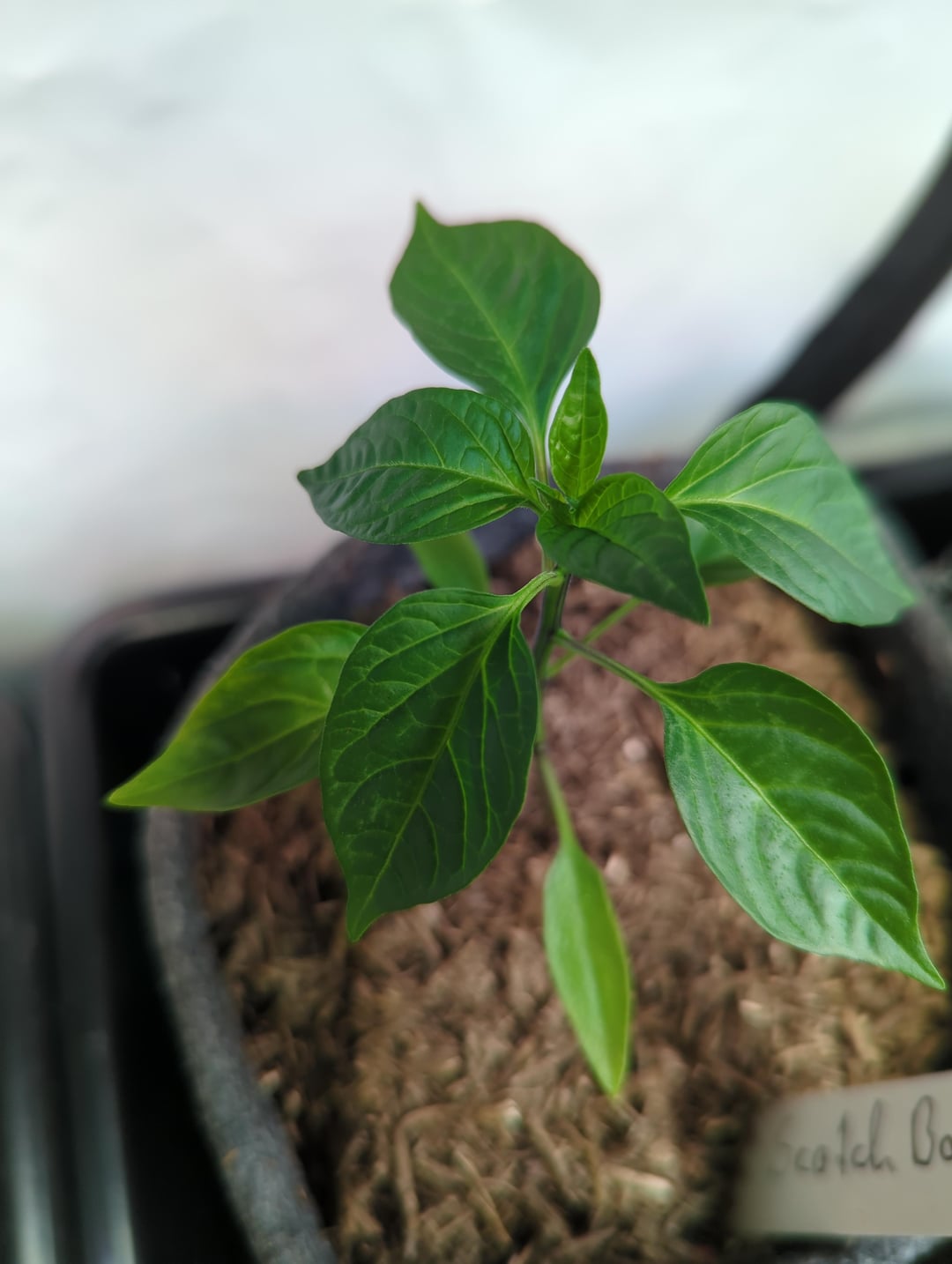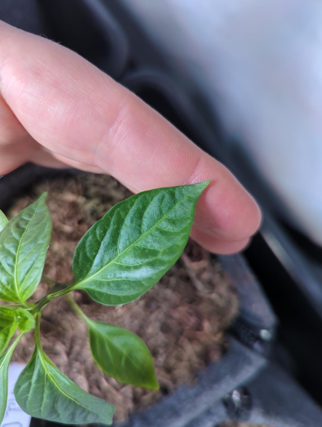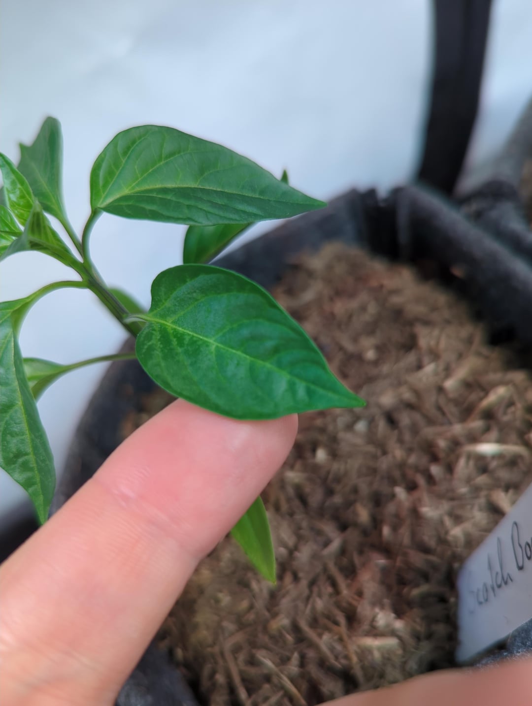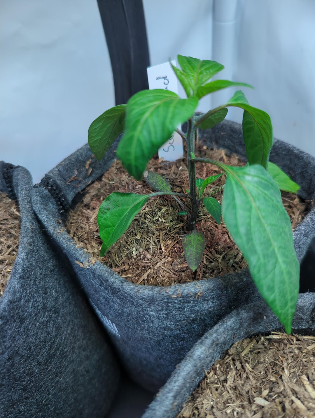 This is my tallest and best-looking pepper at the moment, but things seem to be going south: leaves are starting to curl, and there are whitish spots on them.