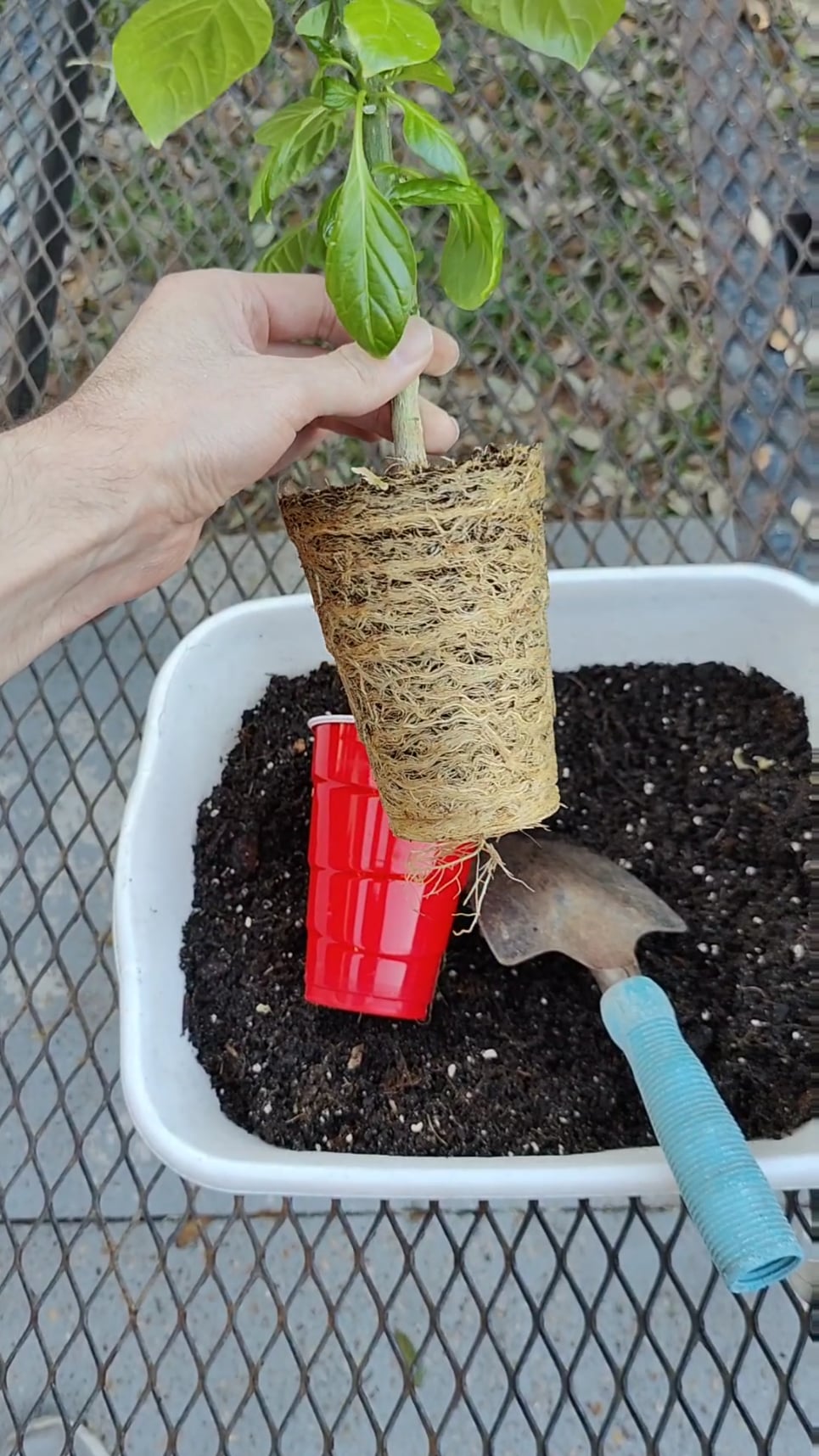 This is my habanero pepper plant i grew from seed about 5 months ago. Always been in this red cup of coco coir, indoors in my grow tent. I did chop it back at least twice to keep it small. I water it with maxigro every time. Finally took it outside to repot.