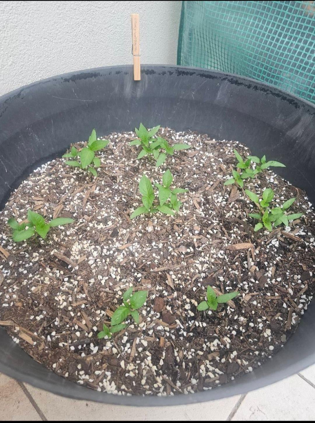 This is a bit of an experiment trying different soil mix as well as different spot. Seem to be pretty happy so far. Planted in clusters as previous batch of Hungarian Yellow Wax peppers not a single one sprouted out of 30. Thus went overboard.