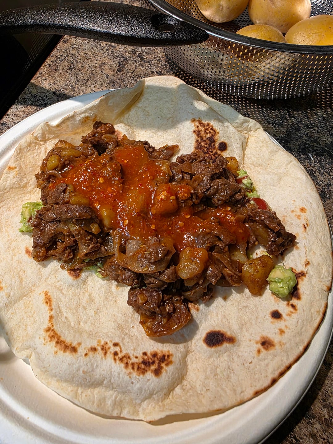 I thought I was defrosting picanha steaks. Turned out to be big chunks of stew meat lol. I already had potatoes boiling for a mash so I pivoted and made some carne con papas for burritos. Nothing fancy. I smashed an avocafo with chopped tomatoes and rhe salsa is from a emxican storez homemade. I went a little heavy on the cumin but otherwise they were delicious.