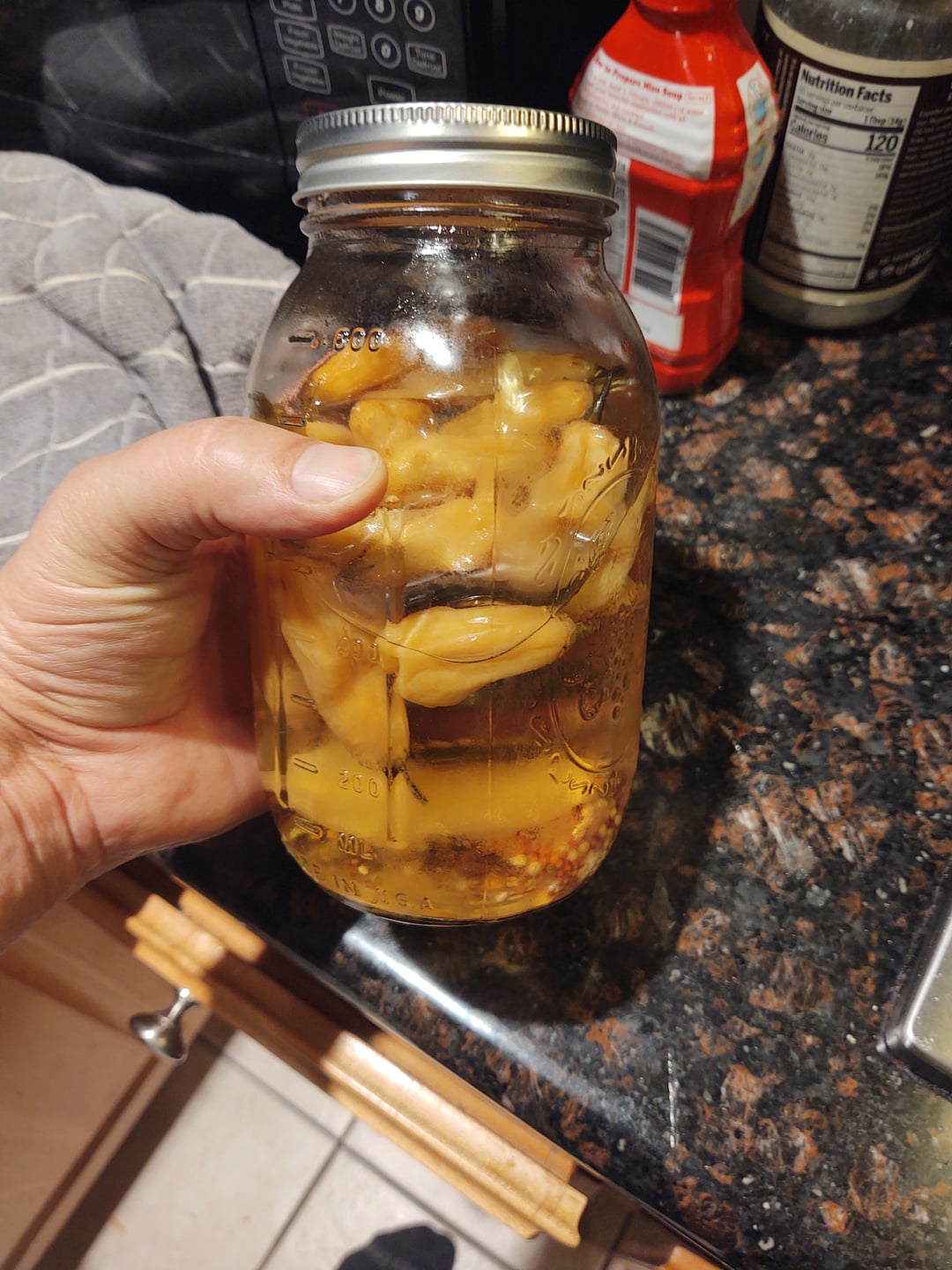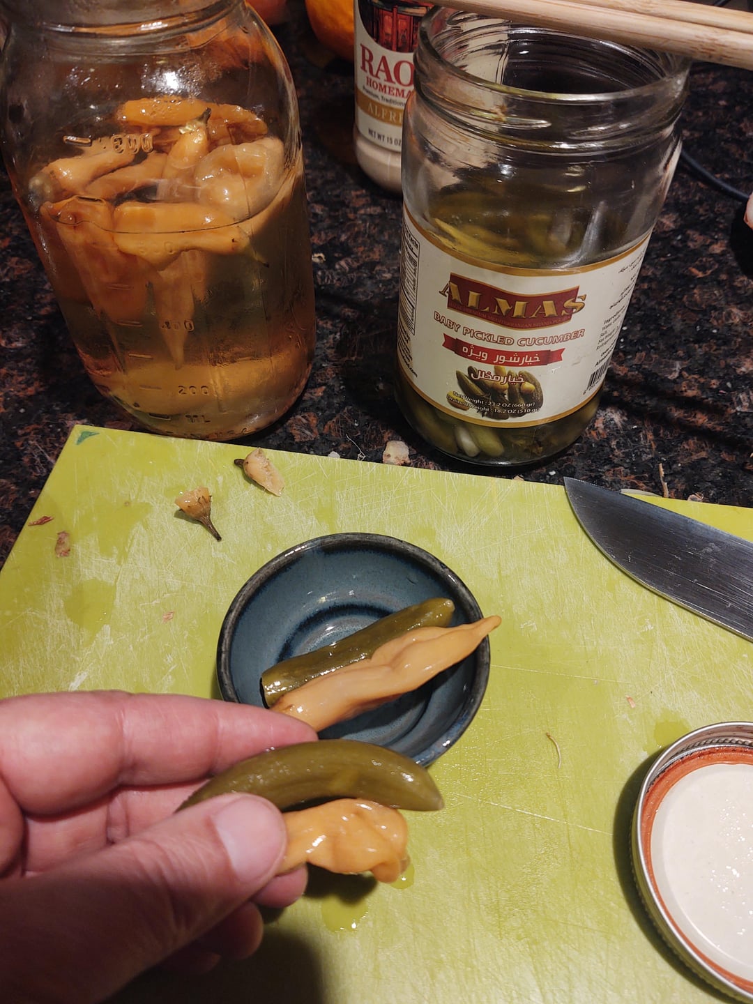 I'm down to the last of my pickled sugar rush peach peppers from last year. They're in a sweeter brine and it smoothes out the hotness a little. I was enjoying them mixing them with middle eastern cucumber pickles. Unfortunately they didn't survive overwintering so I have a new sprout started.