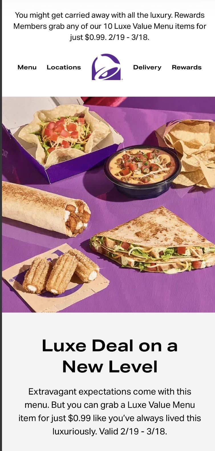 Got this in my email today (2/23) but it doesn’t appear to be working. Everything is full price when going to check out and there are no new rewards for me to redeem. Anyone else get this and did it actually work for you?by Silver_Customer_1646 taco bellWrite A CommentYou must be logged in to post a comment.