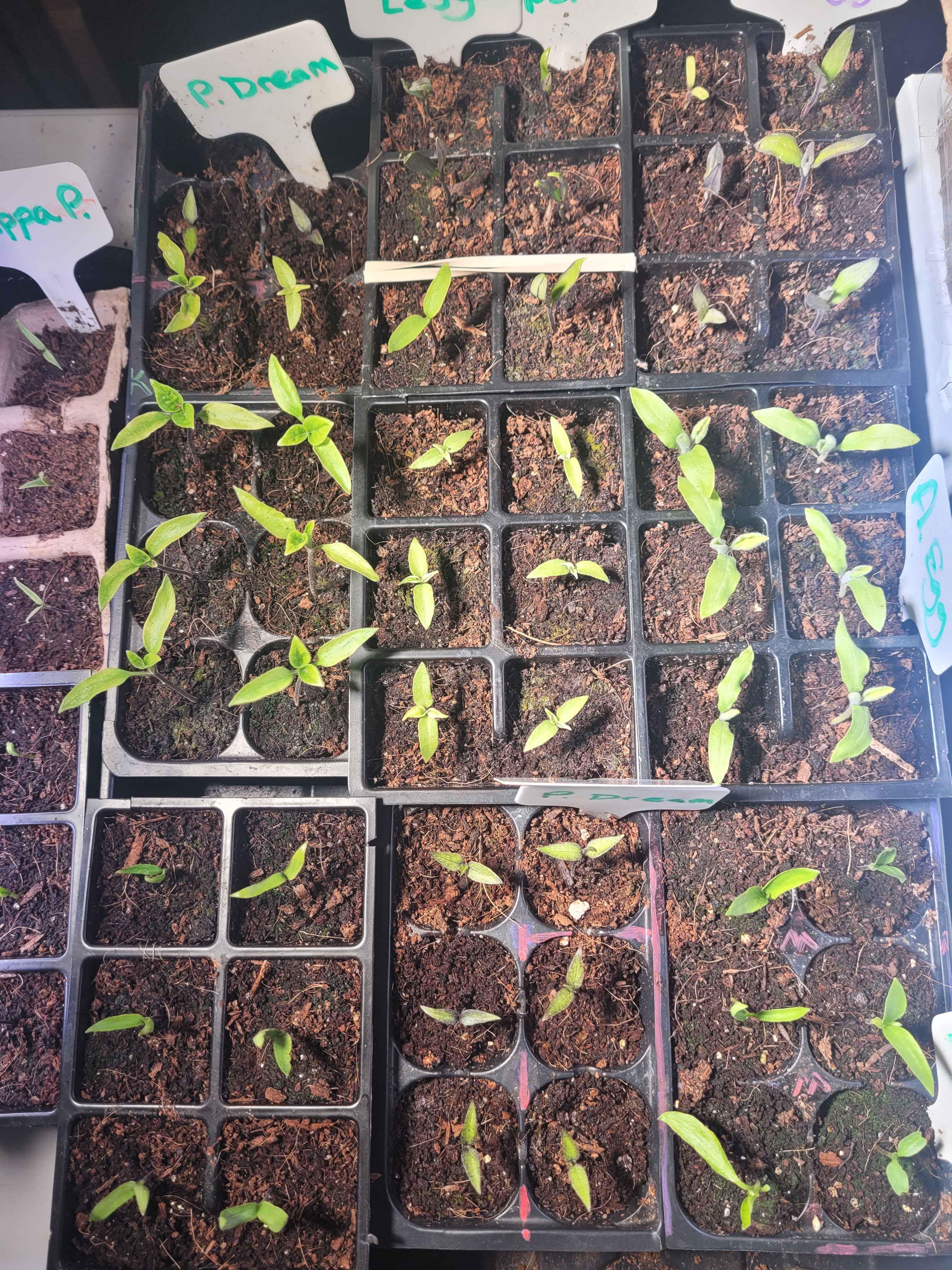 These are all peppers with the exception of the top and middle right trays which are eggplant. New grow light is strong and causing excessive praying, have lowered to 75% to see if they relax a bit.