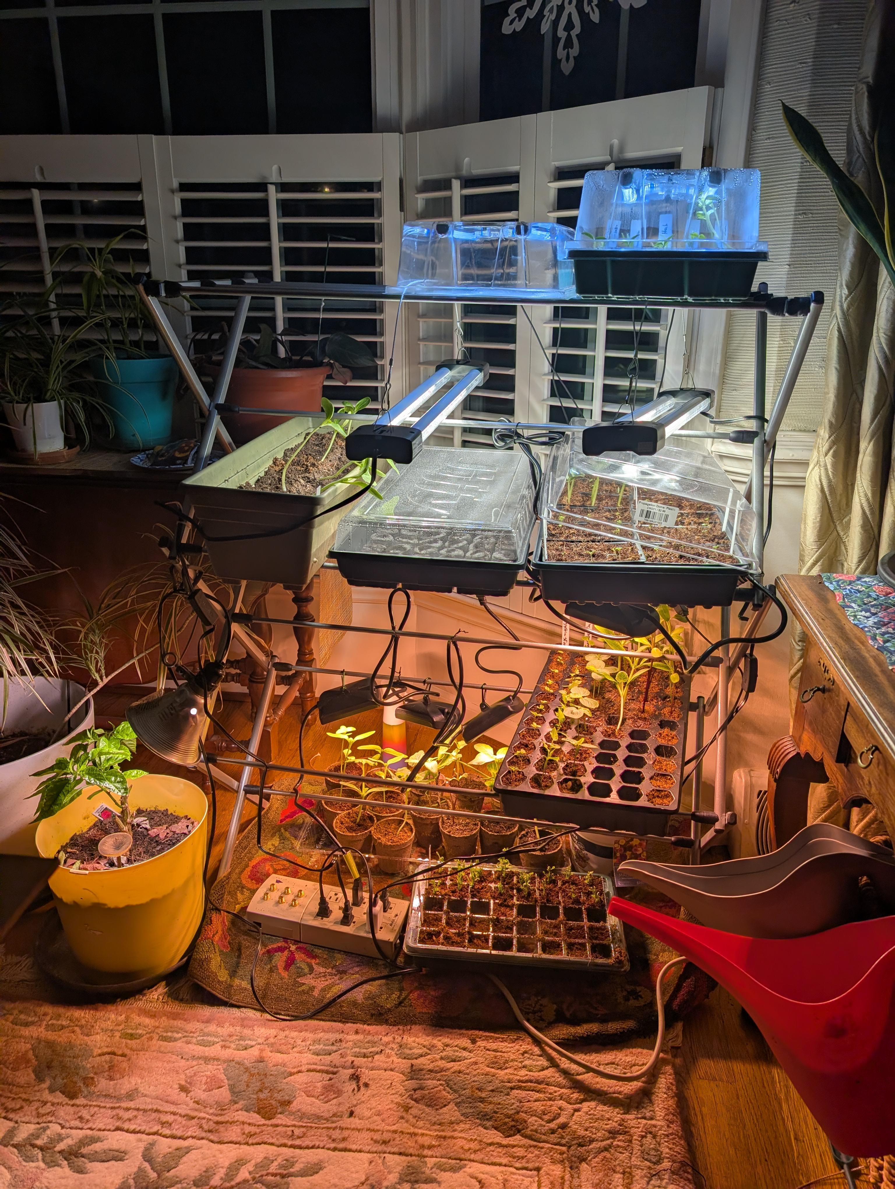 having trouble with my seedling rack. this setup is extremely cumbersome and I'm having trouble getting to my seedlings and watering properly. does anyone know of a good affordable seedling rack that I can hang my lights on? (most of these seedlings are peppers I swear)