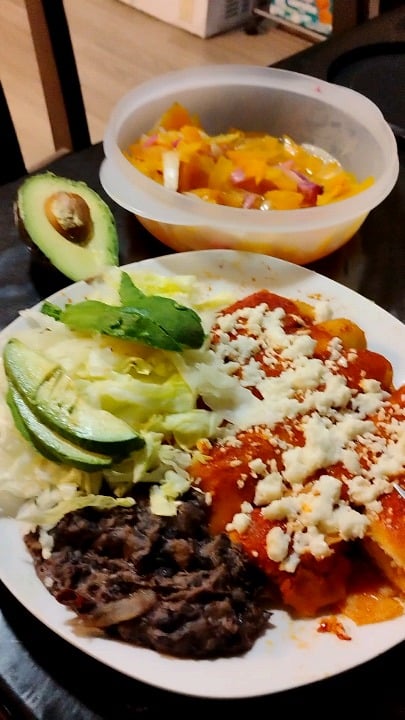 Dinner. Enchiladas refried beans and chile manzano