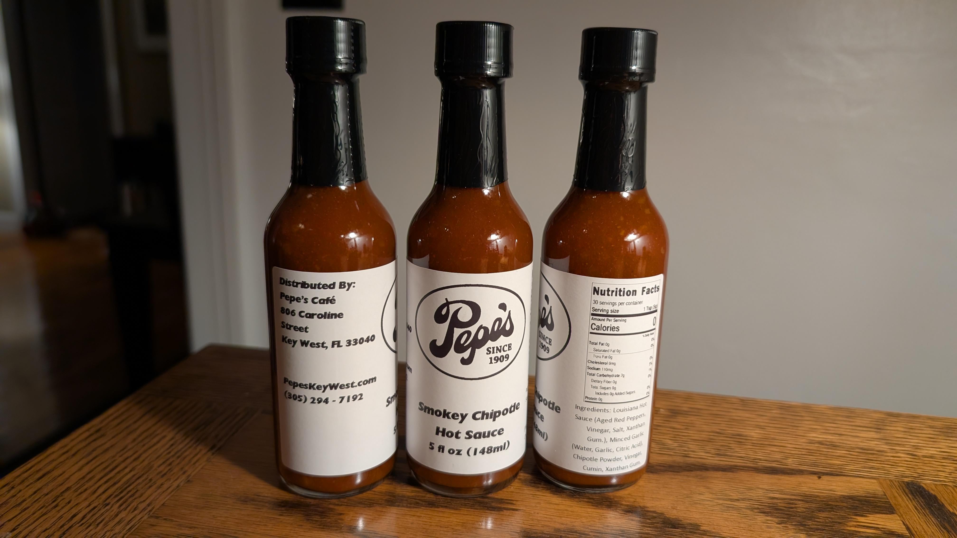 From Pepe's, or Two Friends in Key West. Mild-medium heat, garlic chipotle vibes. This is amazing on a crab cake or eggs benedict – that right little extra without overpowering.