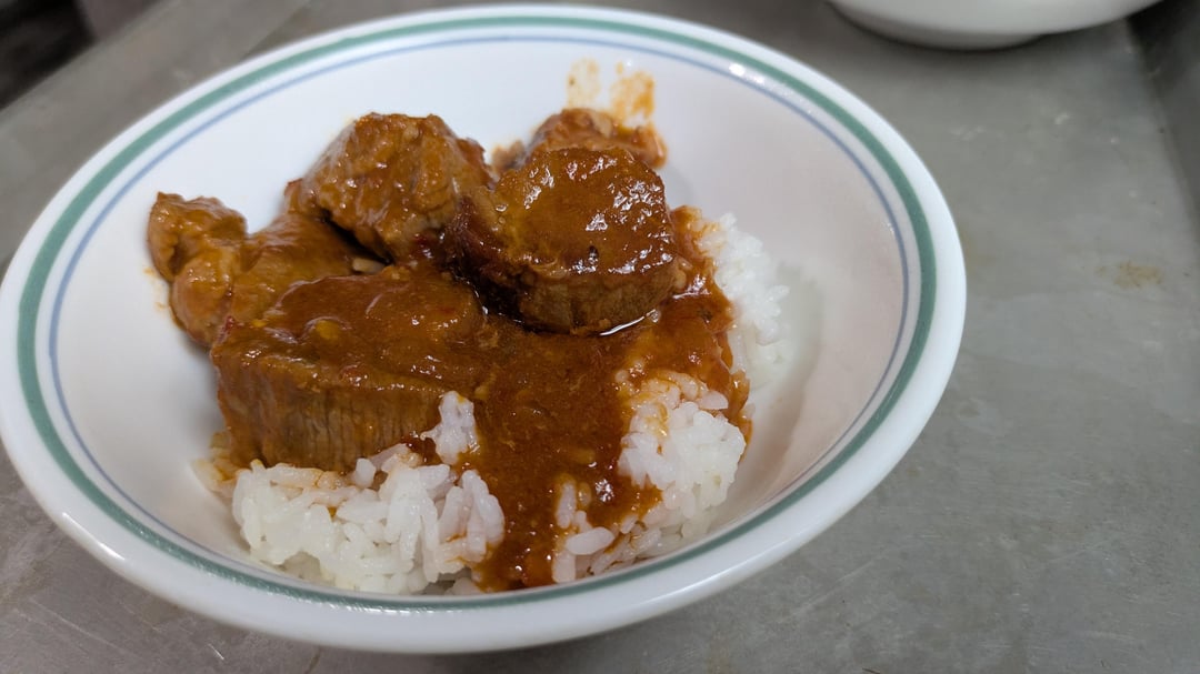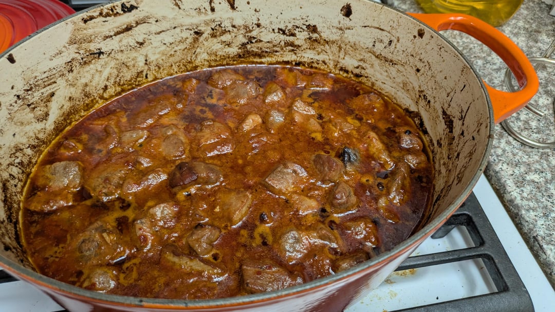 * Cube and sear off about 6-7 lb pork shoulder in batches * In leftover fat, fry off half a diced yellow onion * add 3 cloves minced garlic, 4 minced habaneros, and 6 oz tomato paste and fry off in the fat * deglaze pan with 1 cup chicken stock, 3/4 cup sambal oelek, like half the beer you are currently drinking, a few tbsp of soy sauce, and a good glug of fish sauce * add your pork shoulder back in * add a few good cracks of black pepper * 2 tbsp brown sugar * 1/2 tbsp cayenne * 1 tsp paprika * 2 bay leaves, cuz you’re not driving tonight * stir * cook in dutch oven at 275 f for 3.5 hours with lid cracked * serve over rice