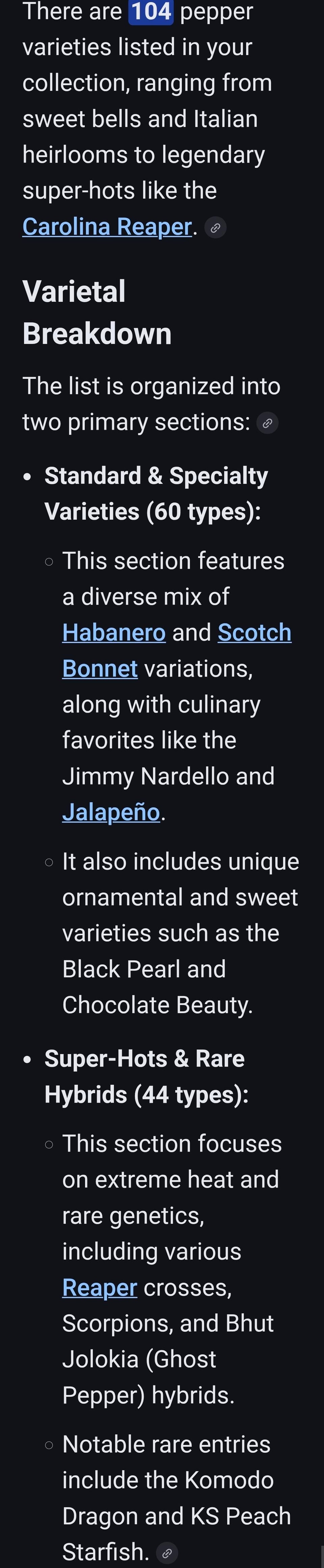 Pretty sure this is everyone. I asked the AI for a headcount – 104 varieties – and got a nice descriptive rundown too. This is my first year really growing peppers and I started back in October, so some of the plants have peppers and others just sprouted a week ago. Had a huge learning curve taking care of 250+ plants but its mostly sorted now.