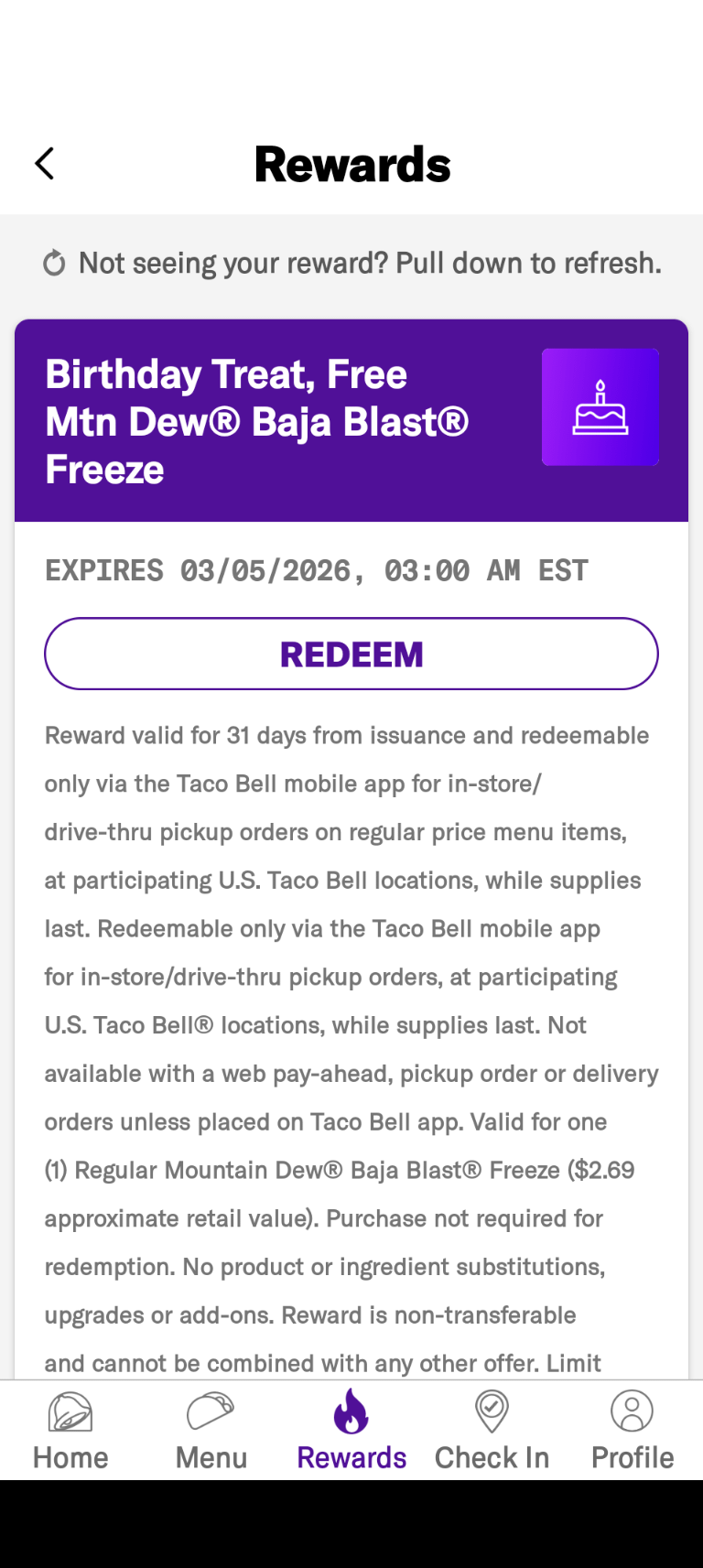 I have a free Mountain dew blast. It seems I can only order it through the app but I am happy to do so. Last day is March 5th. Wish they did something over than this for a birthday but it's ok. Would love to share it since I don't drink more than water most days.