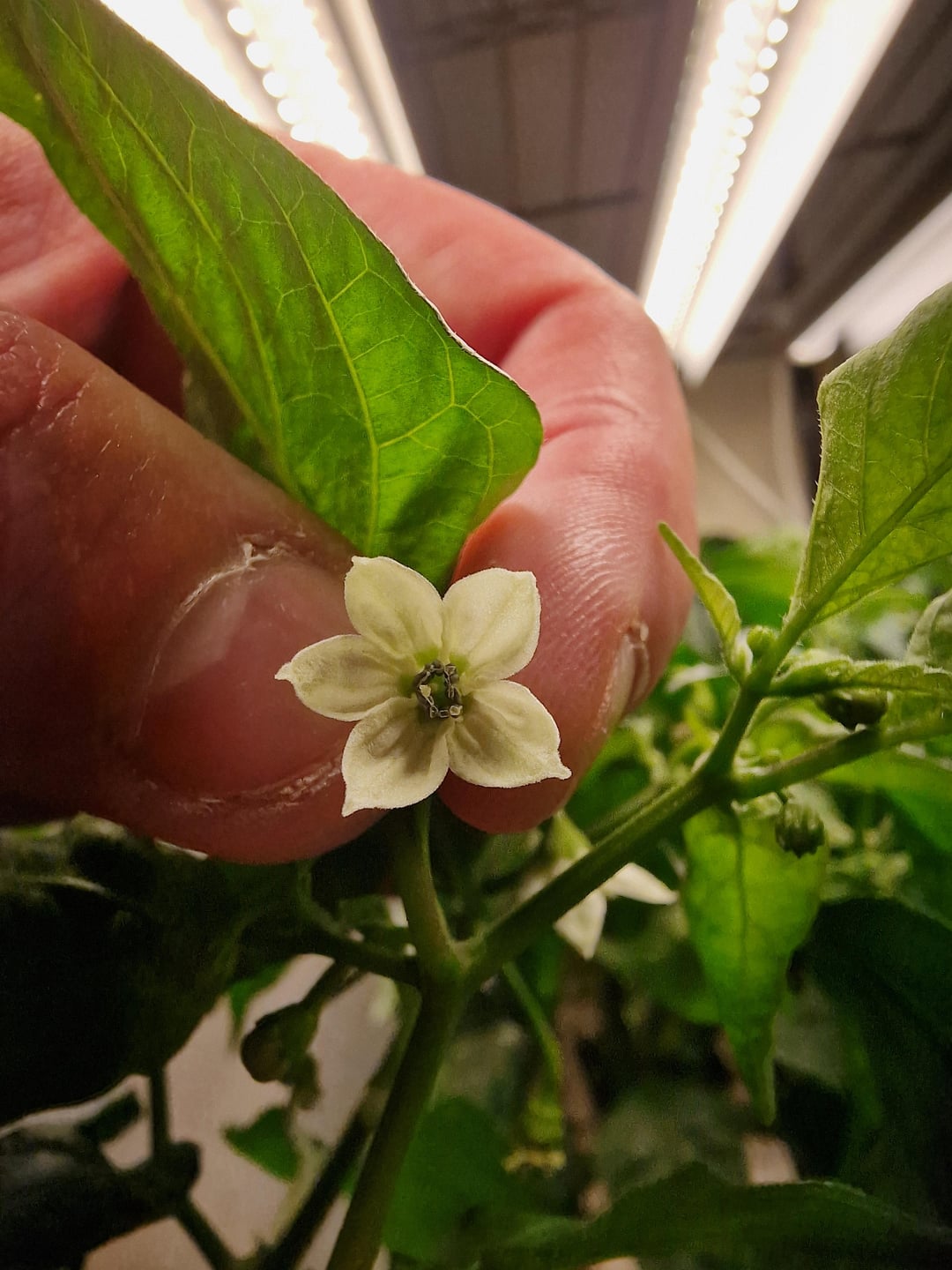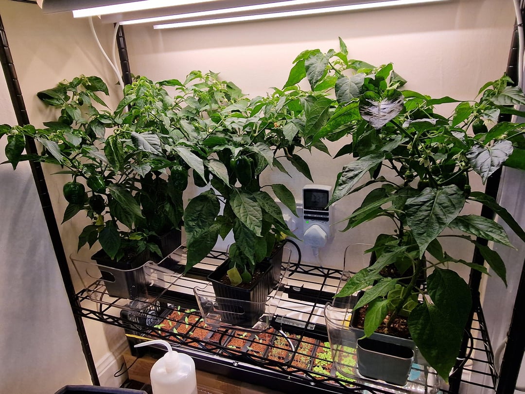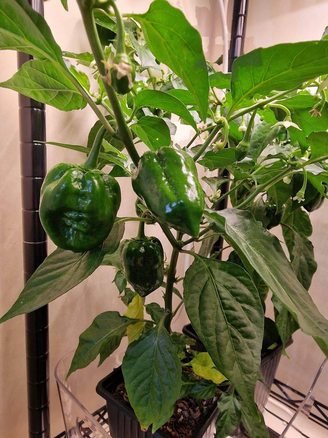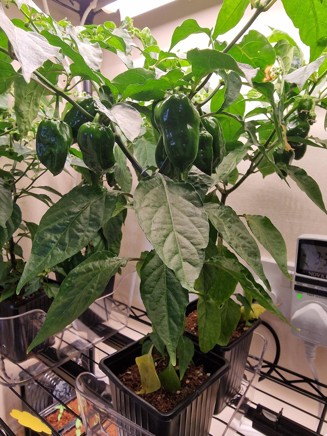 My current guess is Poblano, but that doesn't seem to quite match what I've seen so far in terms of colour and size. I have 6 plants beneath 3 barrina T8s at around 25°C (77F) so they aren't wanting for light, and we only usually water when they're just barely starting to droop so I'm fairly sure that the fruit are correct for their first year size under good conditions. The larger fruits have stayed that way for about a week without changing size or colour. Thank you!