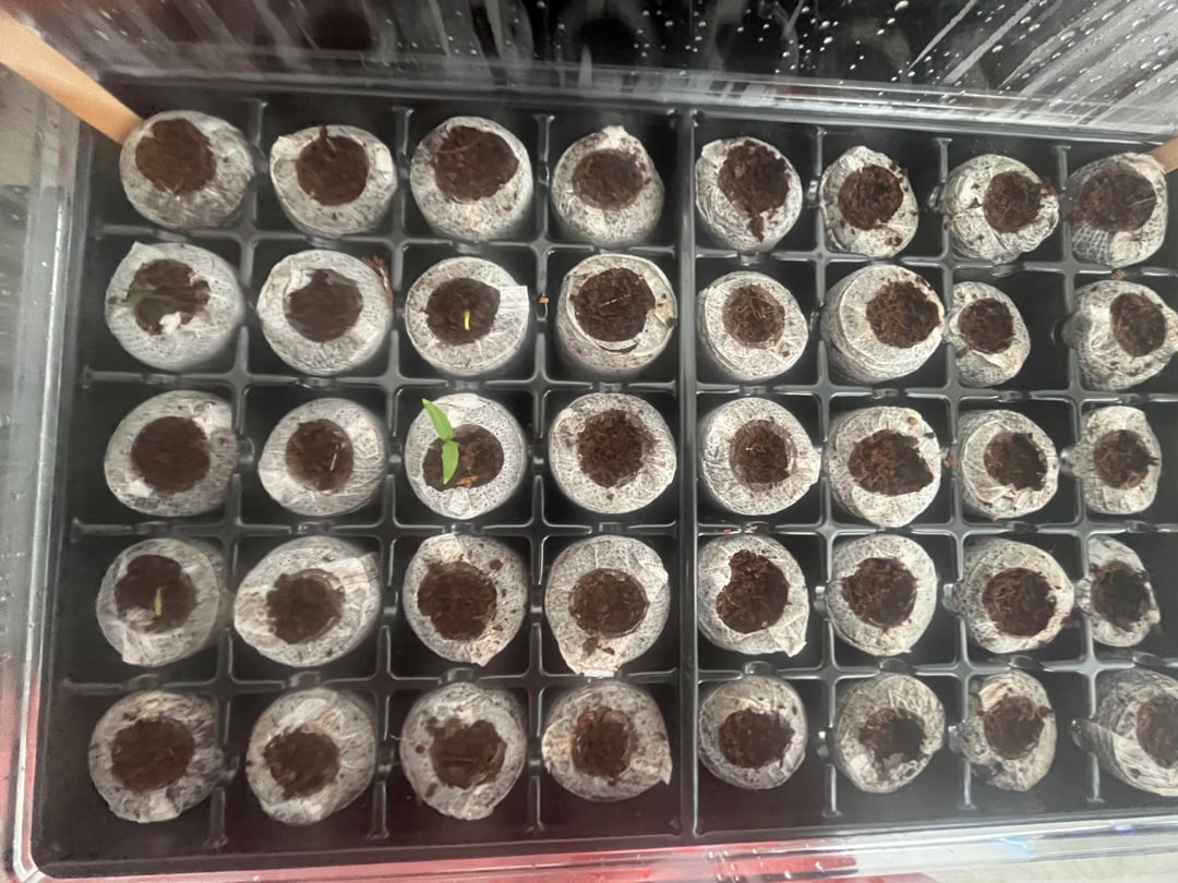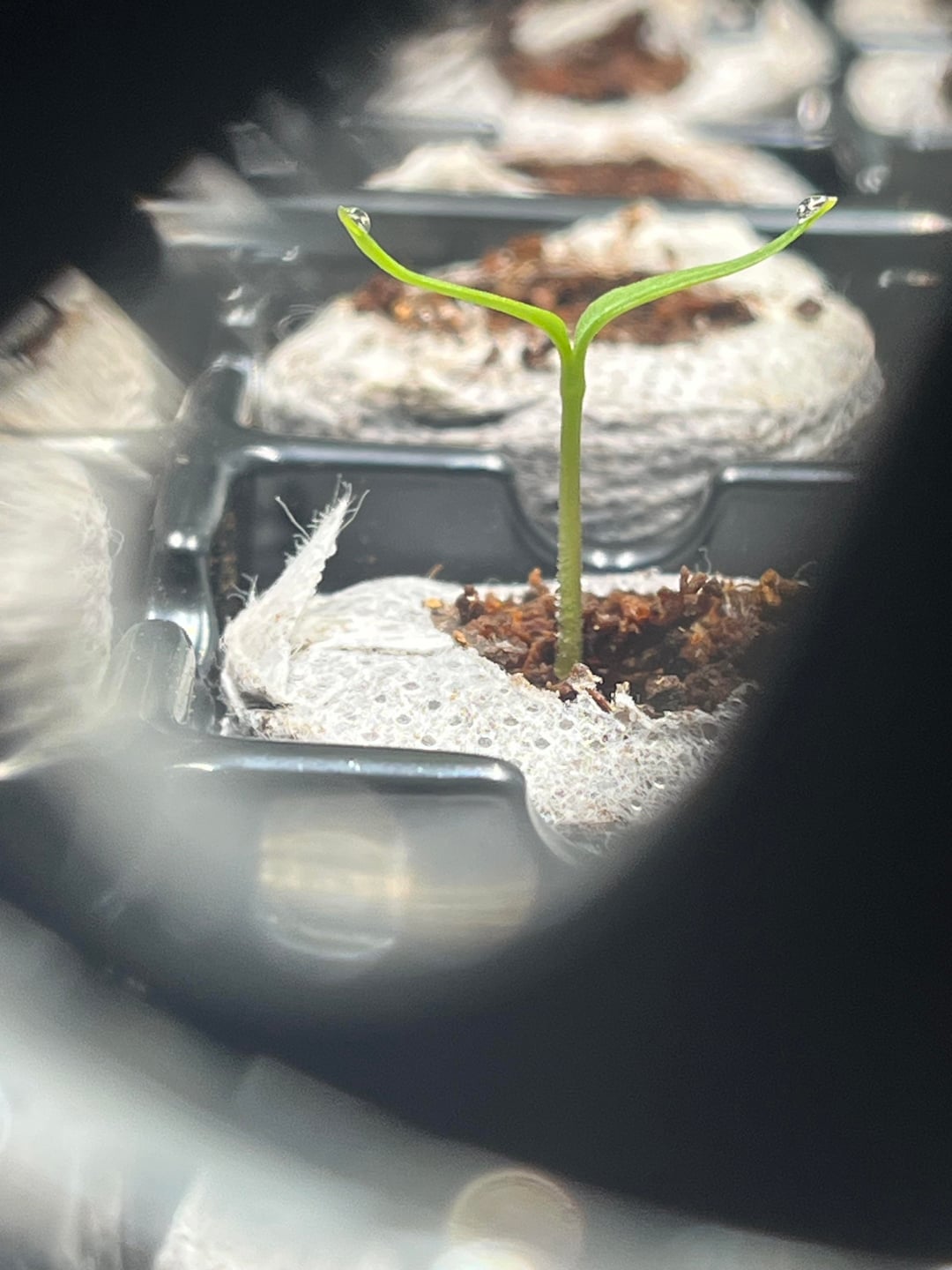 Started an assortment of seeds from Ohio Peppers and the first sprouts are coming up. One of the “Red Cherry Sweet” in particular is growing rather vigorously, and I thought it looked kinda picturesque with its little water droplets