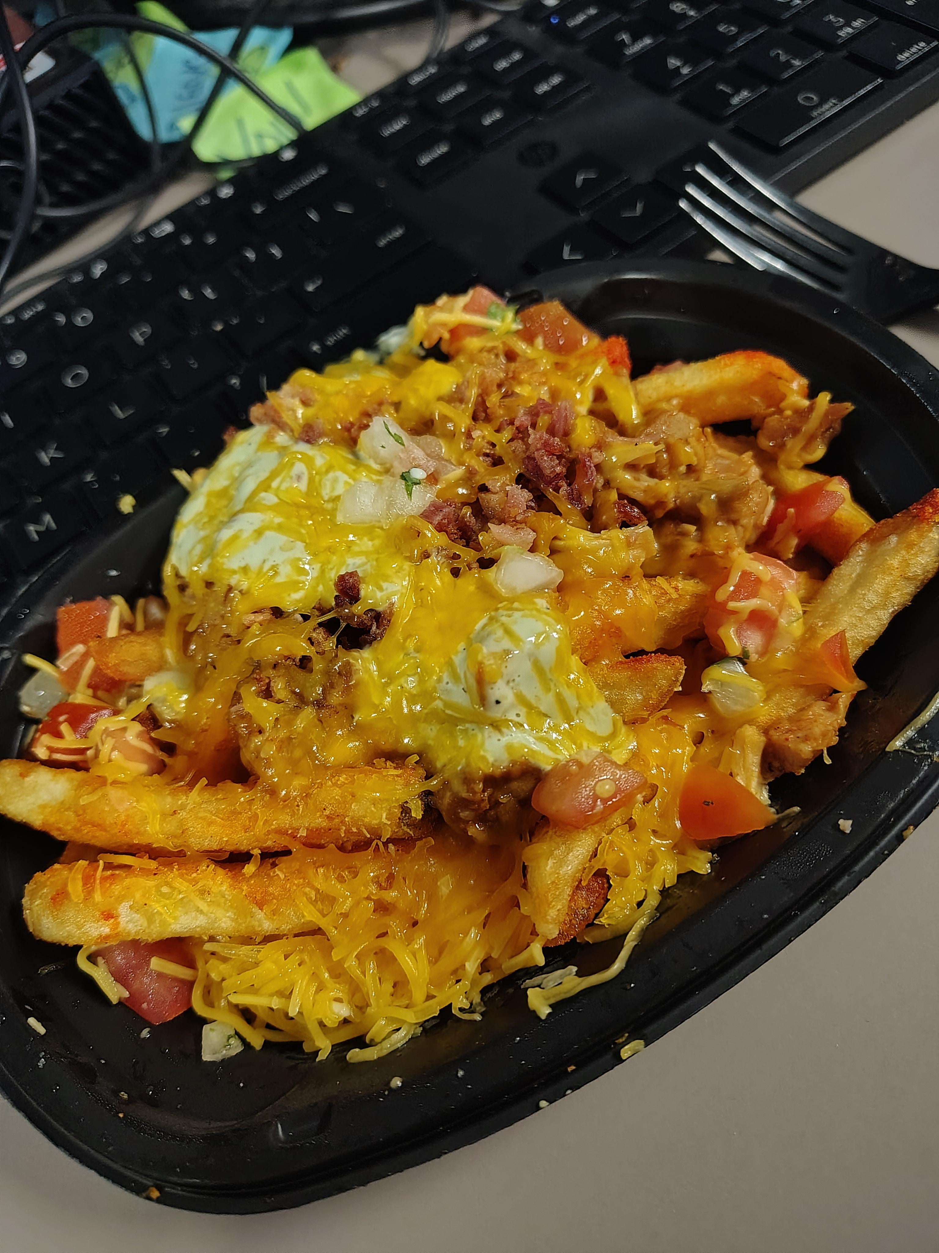 Dunno if I'd get it again, it's spendy for the size… But it was definitely delicious and a fun splurge. Ended up with a big pile of bacon and cheese sauce at the end, decided to dip some tortilla chips in it lol. Could have used more fries, but the container is small, they did what they could haha.