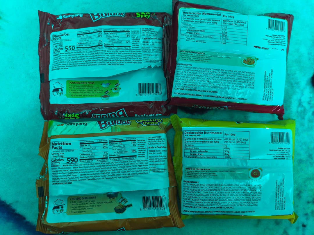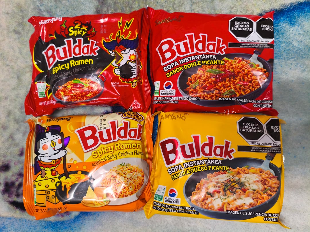 Another random detail: the US version shows Buldak’s mascot, Hochi, on the packaging. The Mexican version (the ones on the right) doesn’t, because mascots have been banned from food packaging in Mexico since 2021.