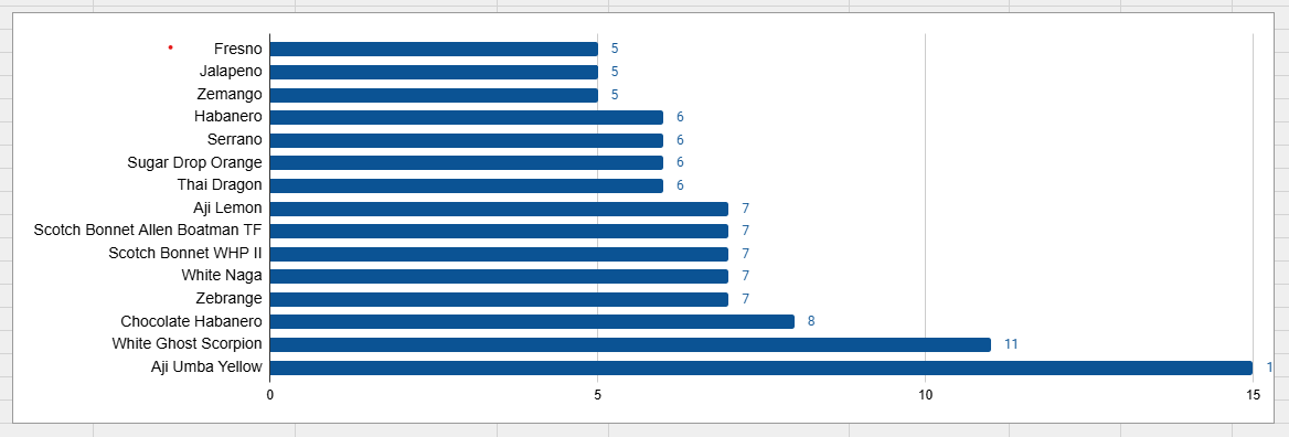 Chart shows fastest sprout per species. Each species was sowed into multiple tray cells. Most of the Scotch Bonnets were slow to sprout, with the slowest taking 18 days.