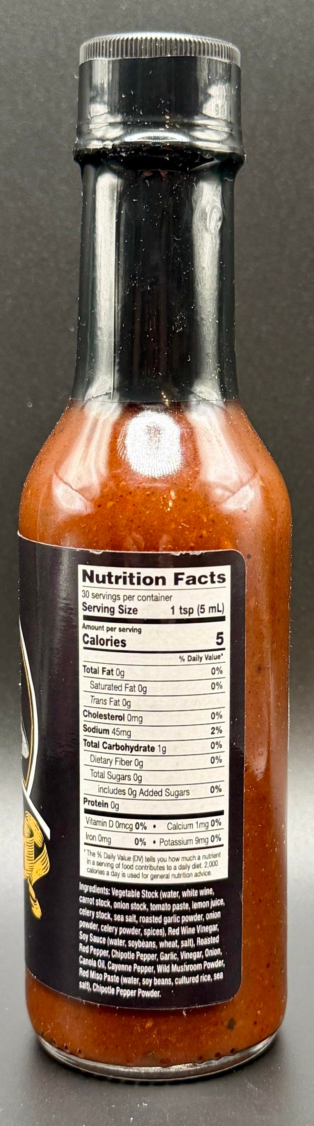 Ingredients: Vegetable Stock (water, white wine, carrot stock, onion stock, tomato paste, lemon juice, celery stock, sea salt, roasted garlic powder, onion powder, celery powder, spices), Red Wine Vinegar, Soy Sauce (water, soybeans, wheat, salt), Roasted Red Pepper, Chipotle Pepper, Garlic, Vinegar, Onion, Canola Oil, Cayenne Pepper, Wild Mushroom Powder, Red Miso Paste (water, soy beans, cultured rice, sea salt), Chipotle Pepper Powder.