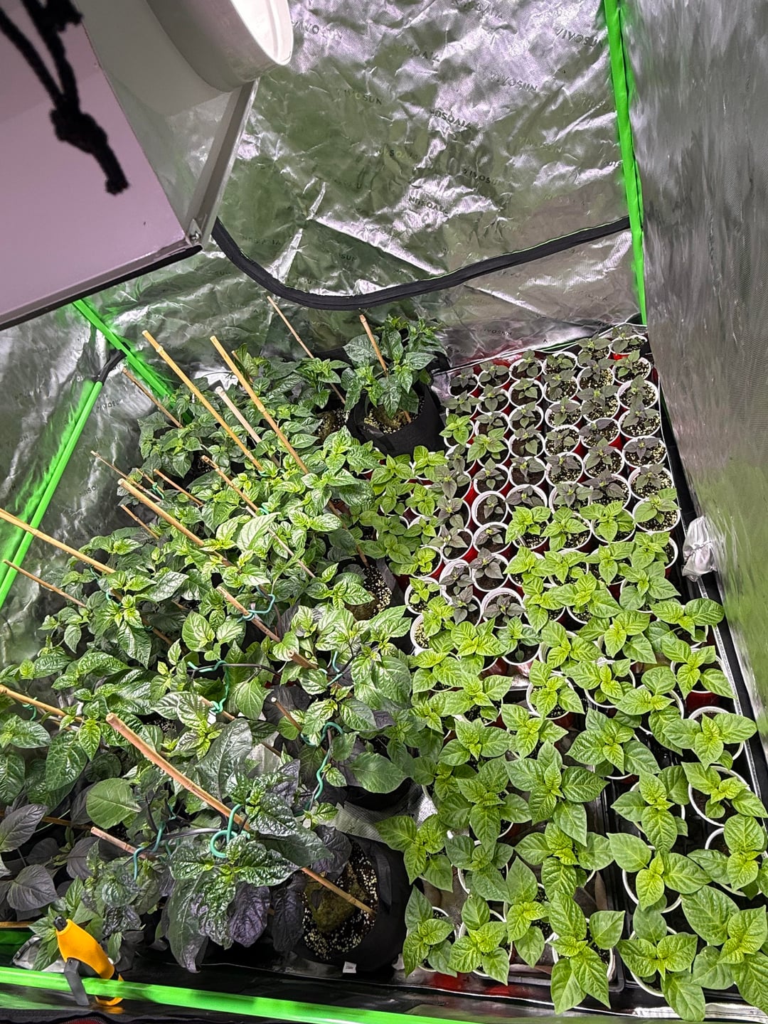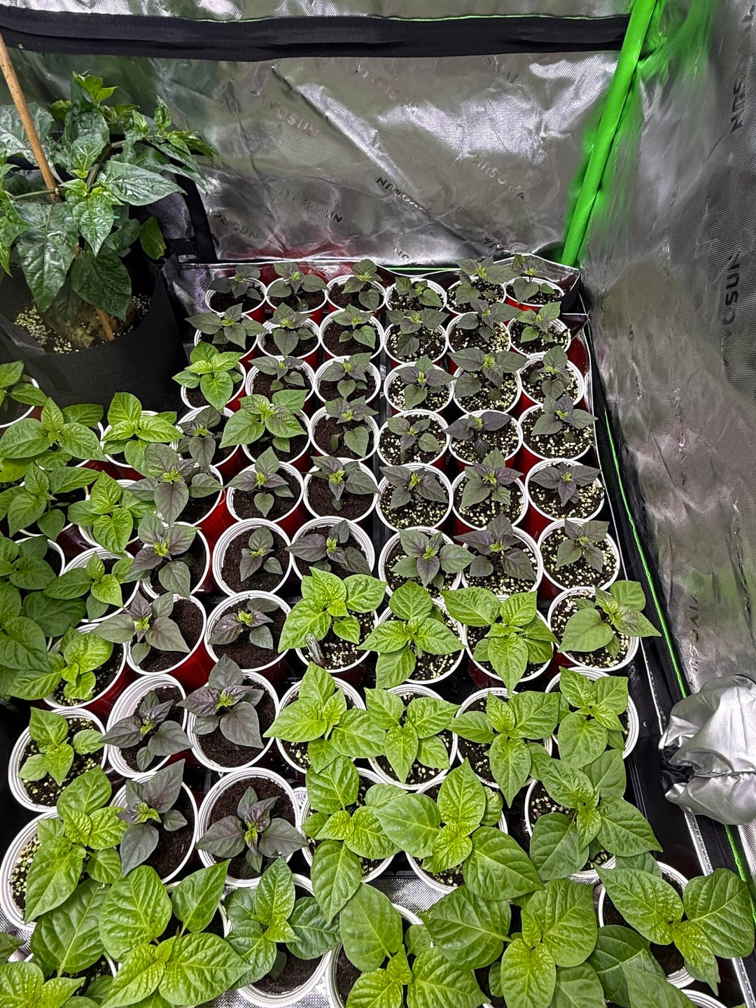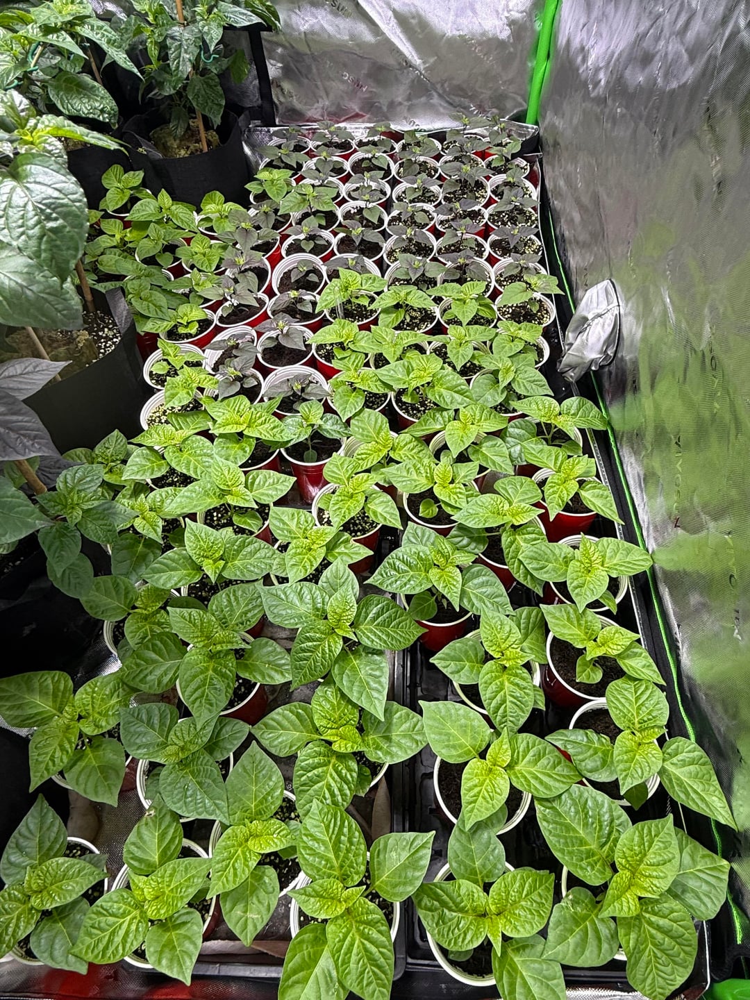 The peppers are coming along smoothly. I’ve training for lateral growth and so far we’re up to 20+ shoots on ghosts. Purple peach ghosts have varying structure and are sensitive to stretching and edema on some. Height on average 16-23” including a topped ppgp. Seedlings have begun to express differentiating traits as they progress. Largest seedlings are white habanero* and display vigor compared to ppgp initially.