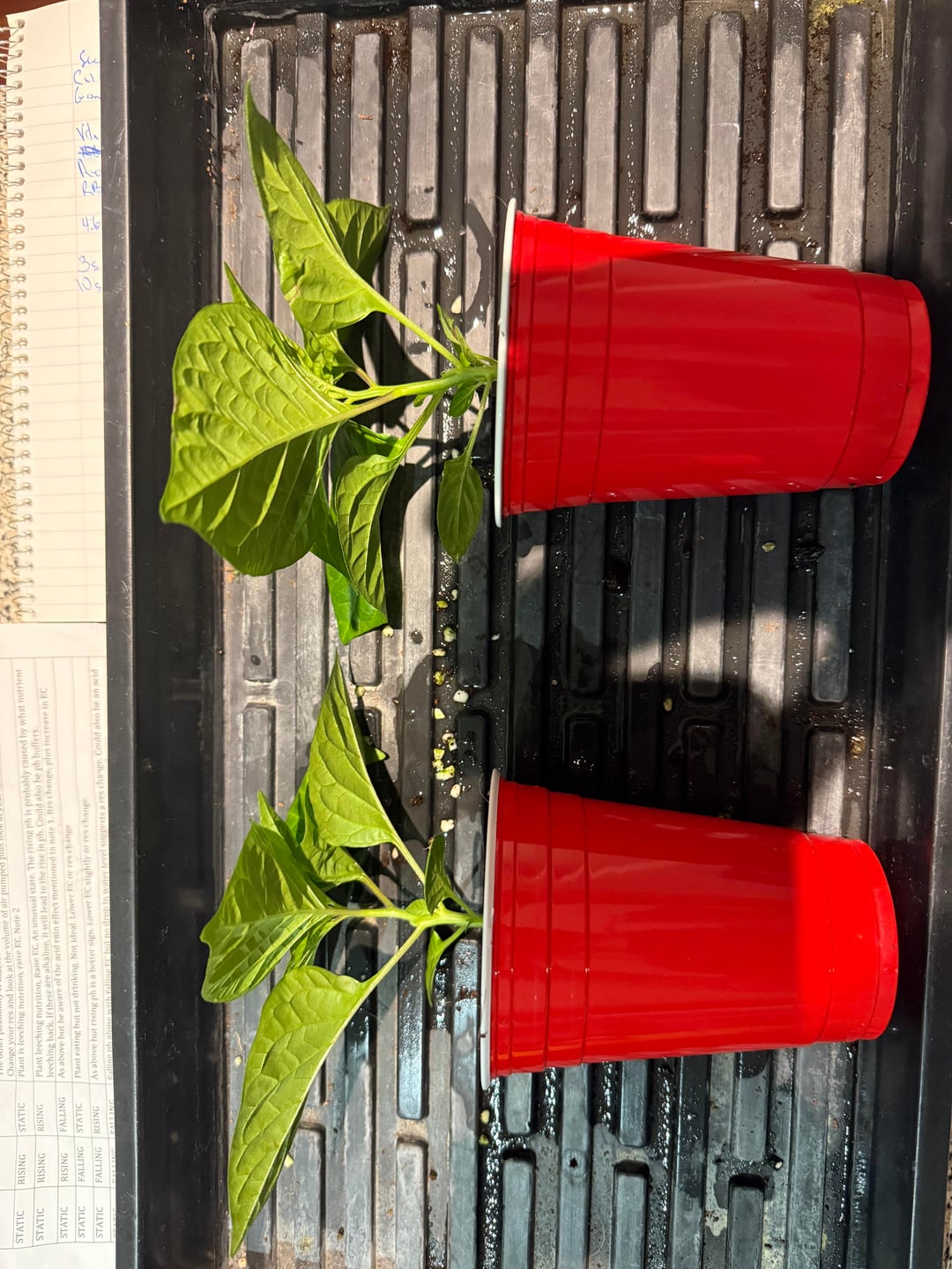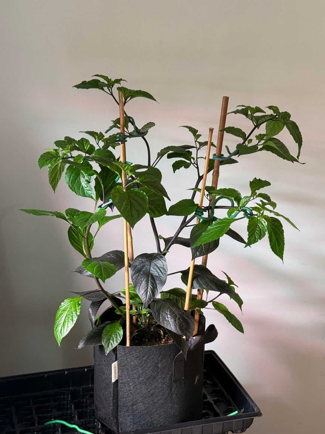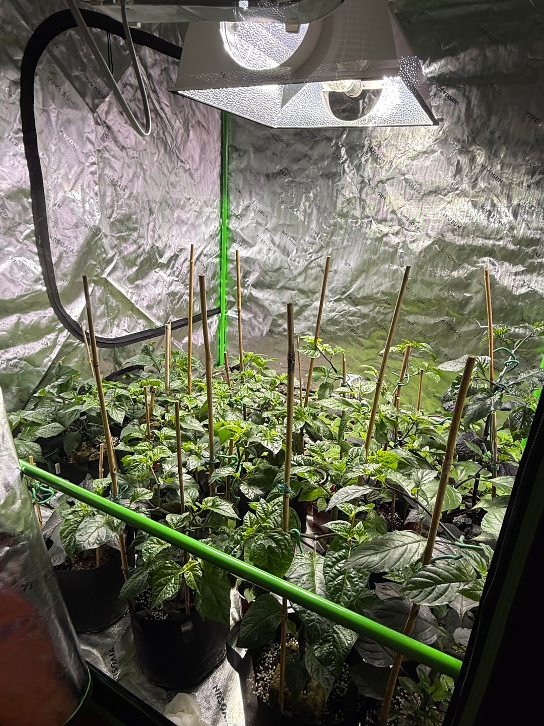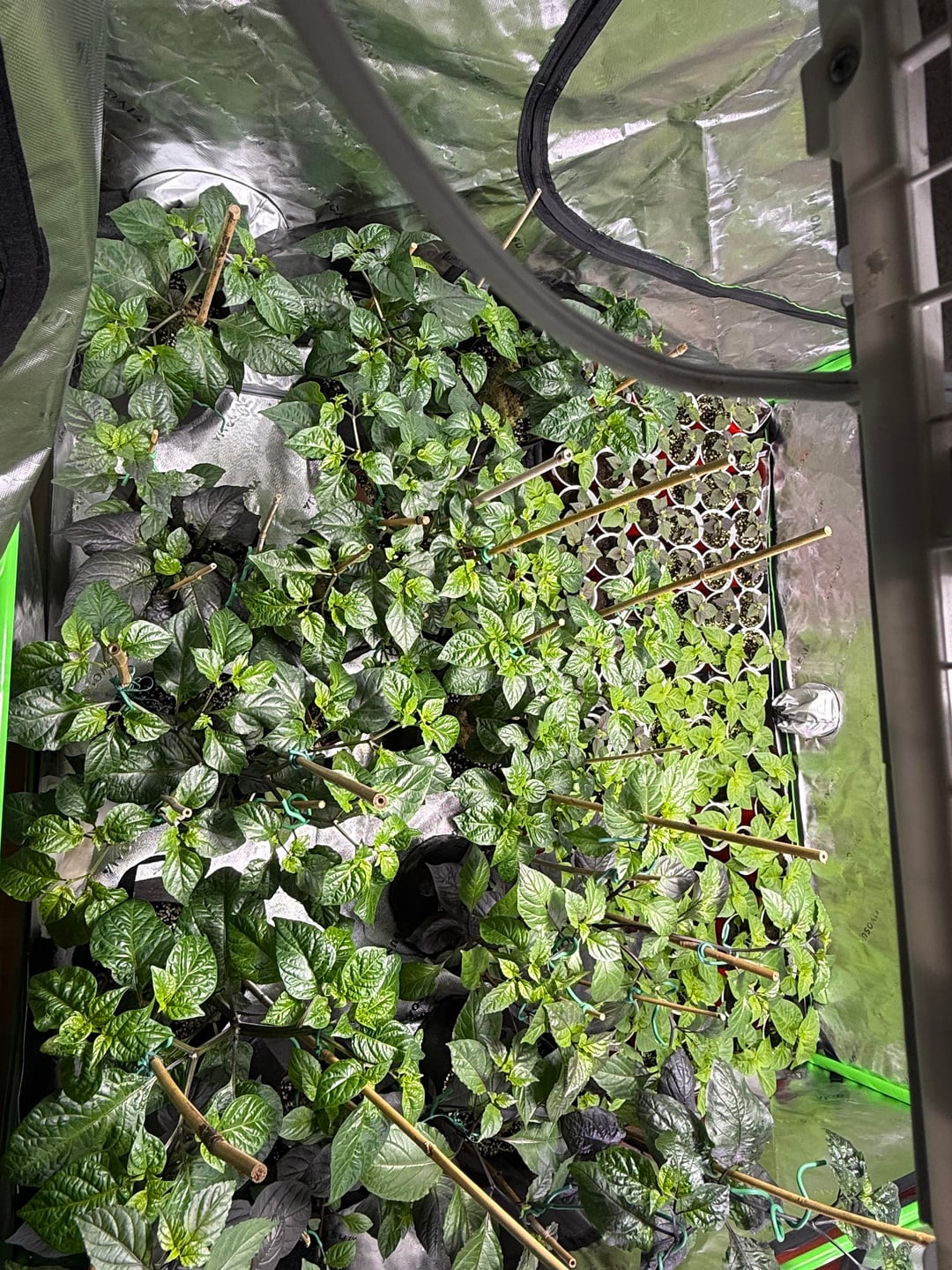 The peppers are coming along smoothly. I’ve training for lateral growth and so far we’re up to 20+ shoots on ghosts. Purple peach ghosts have varying structure and are sensitive to stretching and edema on some. Height on average 16-23” including a topped ppgp. Seedlings have begun to express differentiating traits as they progress. Largest seedlings are white habanero* and display vigor compared to ppgp initially.