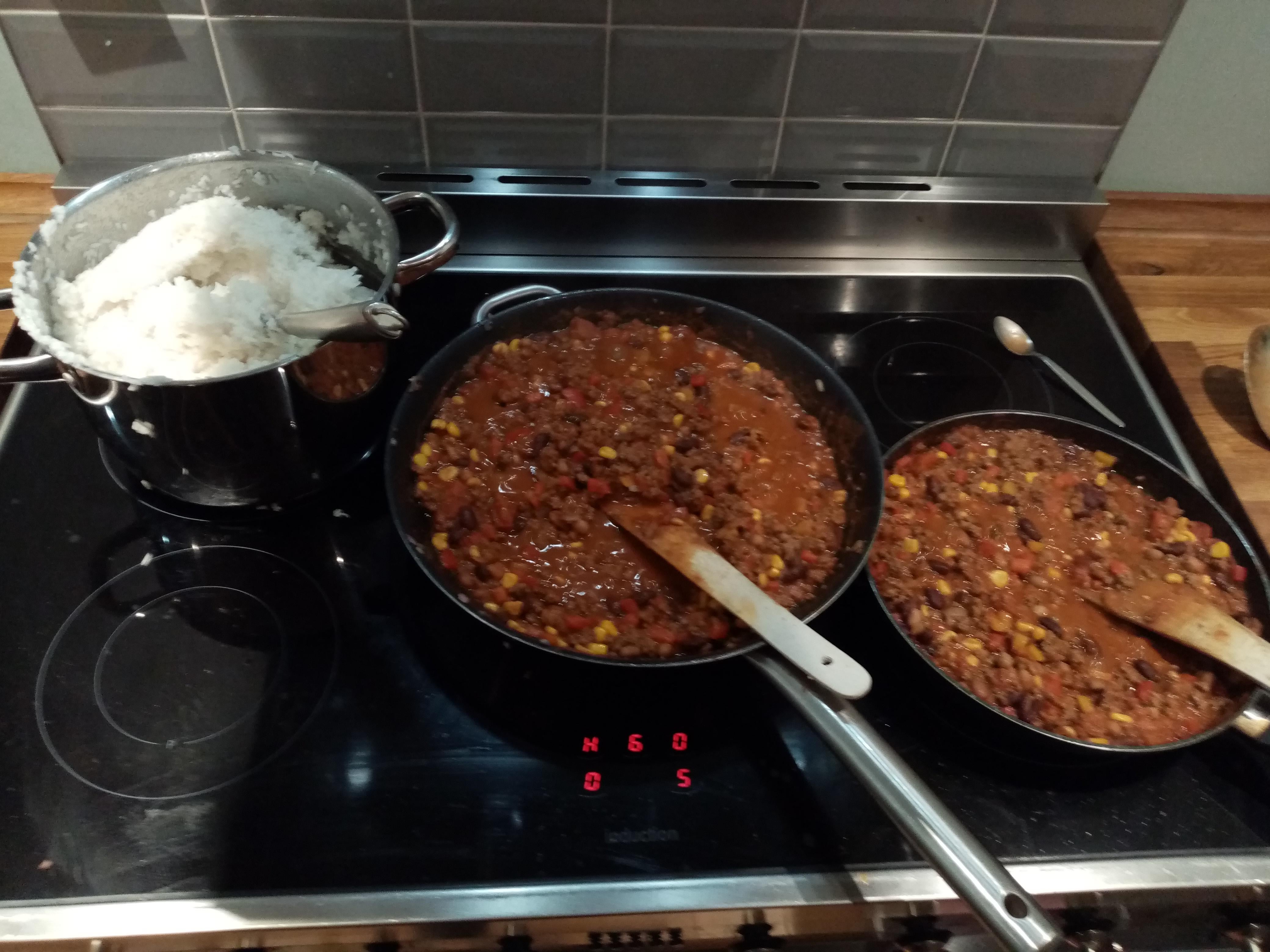 I somewhat imagine this is tame compared to what some families would actually cook however this is an obscene quantity for me, a British Student. A full kilogram of beef went into this as well as several tins of beans and two massive bell peppers, along with a whole load of other stuff. Cooked a full kilogram of rice alongside it. I reckon I made 10 large portions of food and about 5.5kg total. So just a small quantity. Should have cooked more rice though because two of the portions have none to go with it.