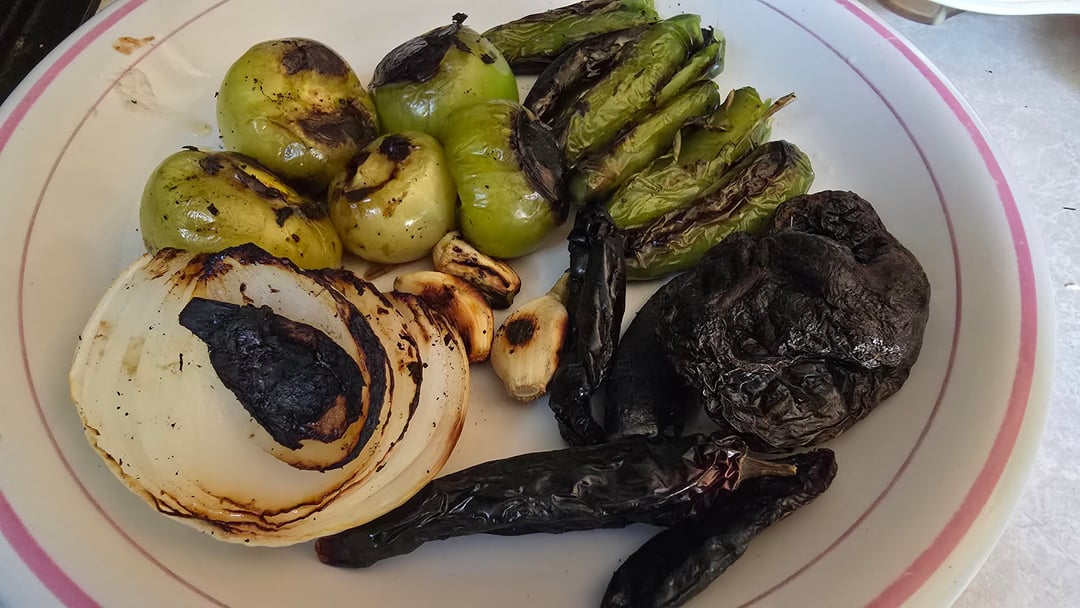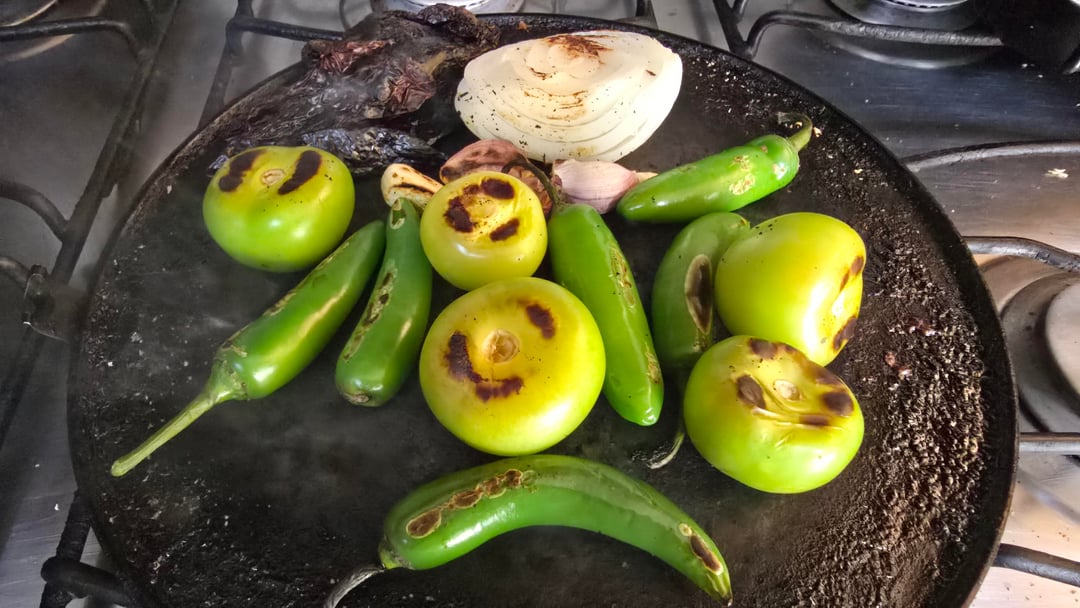 Toast the chiles, onion, garlic and green tomatoes on a comal or skillet until soft and toasted, green tomatoes and serranos should take a duller green color.