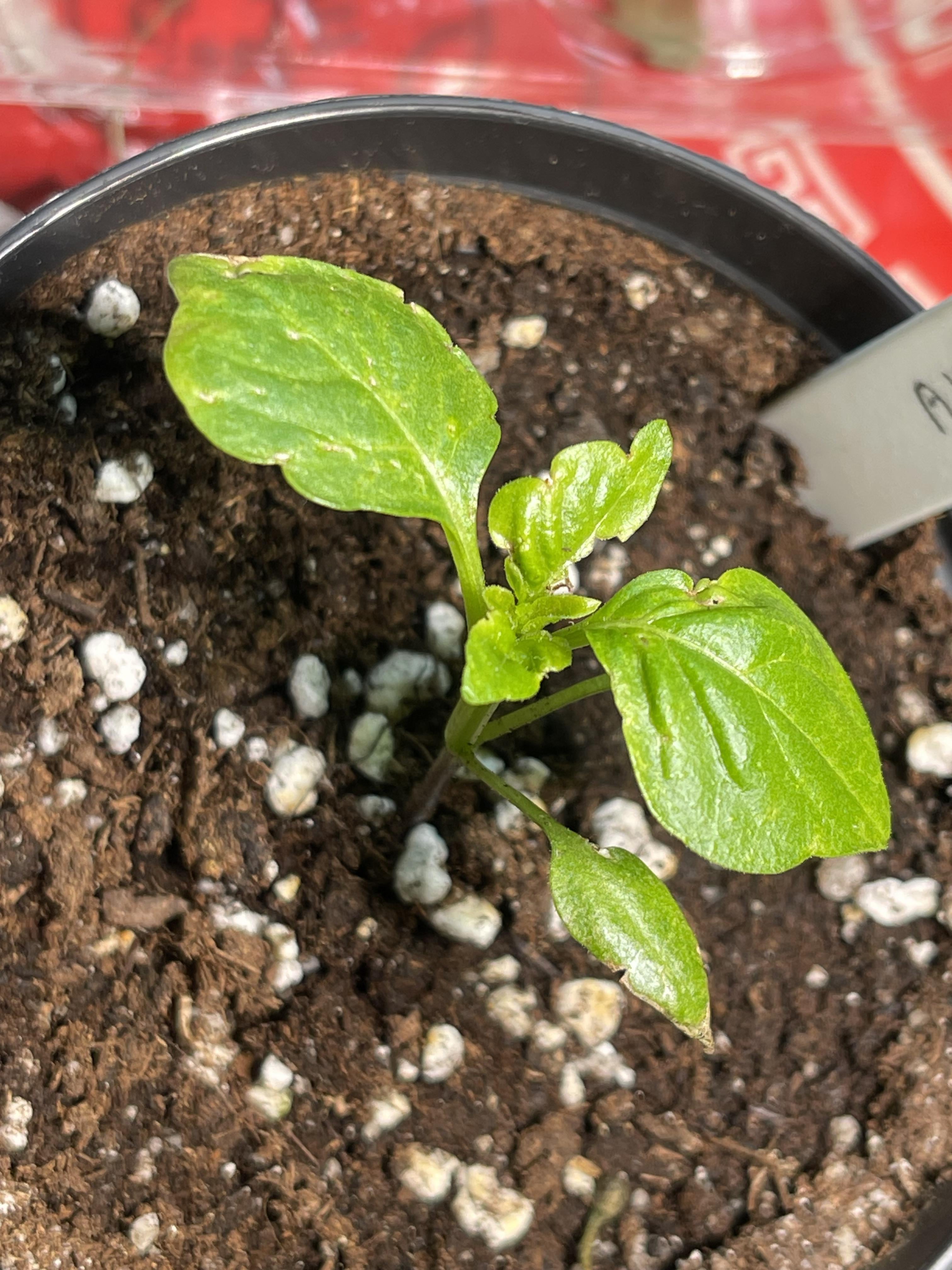 This is my first experience with Aji Amarillo or any Baccatum. It's been growing much slower than the healthy looking Habanero next to it, under the same light. Today it also dropped one of the first true leaves. The new leaves seem distorted and damaged.