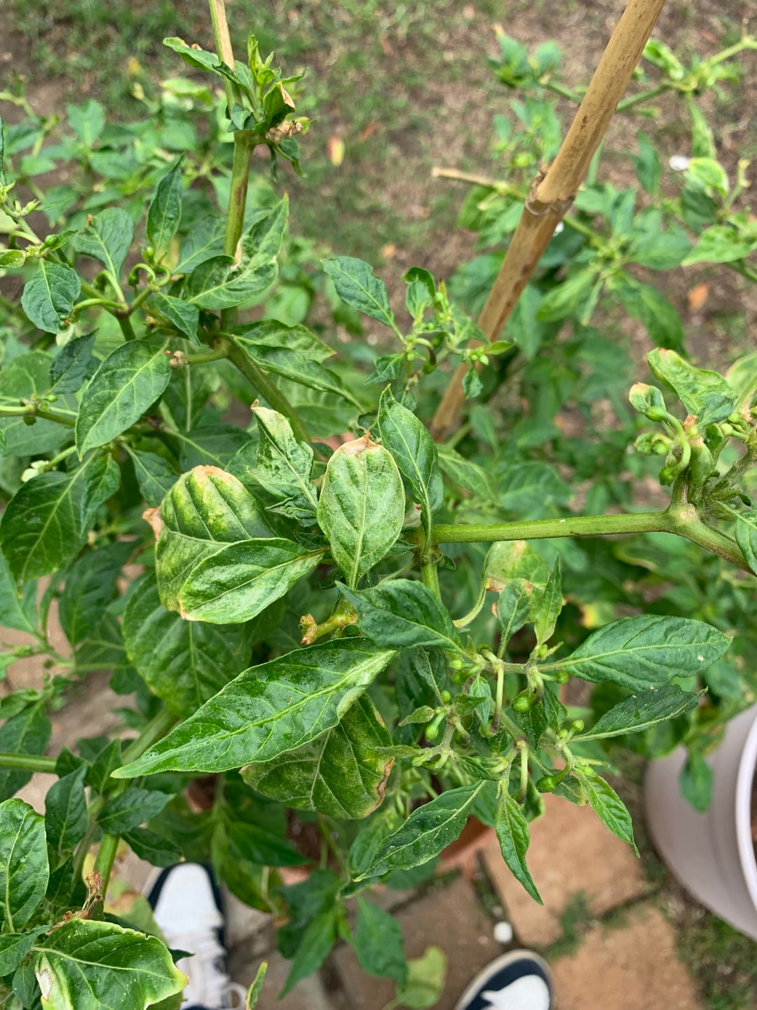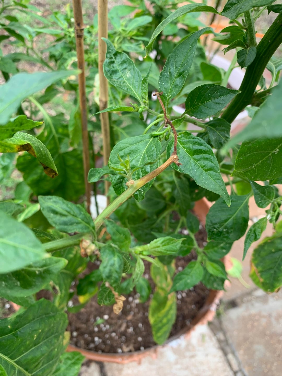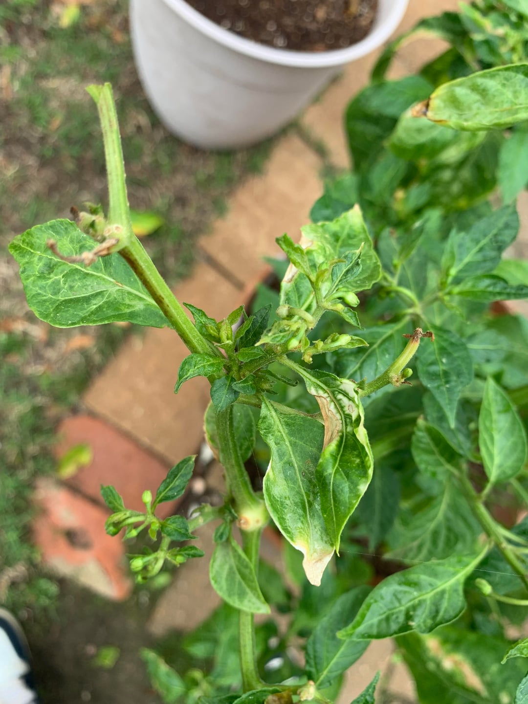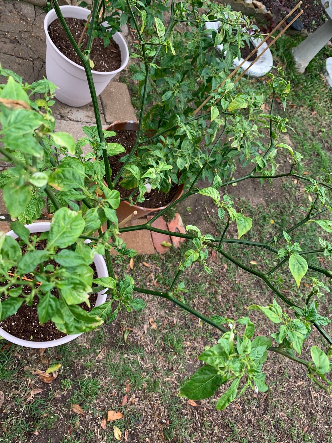 hese 3 didn’t get pruned or layed dormant during winter , I started late and when it started to get cold I brought them in and let them do their own thing after a while they started to stress fs because of light and aphids , soon after it got hot and I took them out , soon far they seem to be thriving and growing but I did notice some old stems turning brown and some white ish leaves any thoughts
