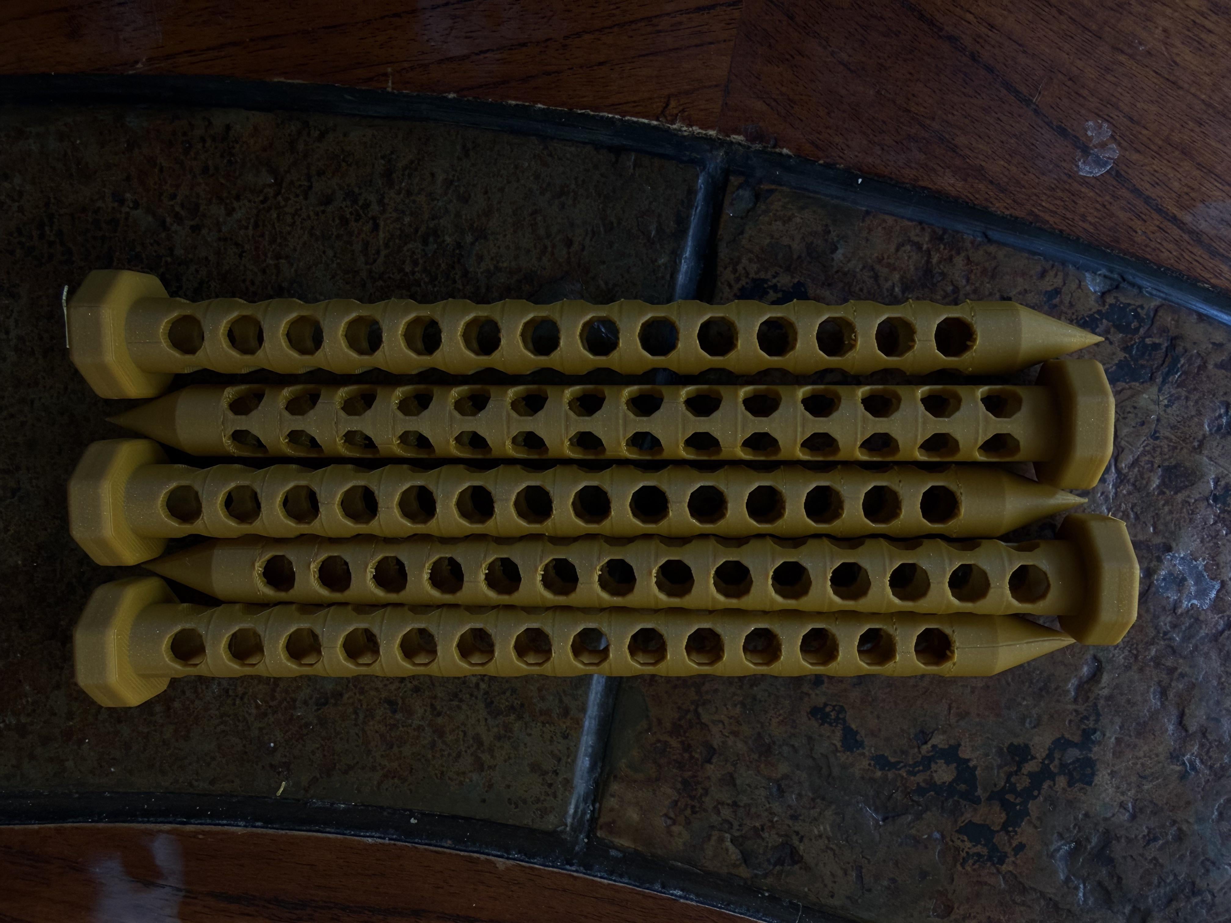 These stakes are hollow with holes at regular intervals. Even if they just clog up, they easily break through soil (just tested them out) and can potentially mitigate some of the drying out issues where the top layer became waterproof and any use of top watering just ran down the sides of the bags, forcing me into the laborious task of bottom watering an unsightly number of grow bags daily (which worked very well, but a lot of work). Printed these out today from a model, but think the bore should be at least 2x this size.
