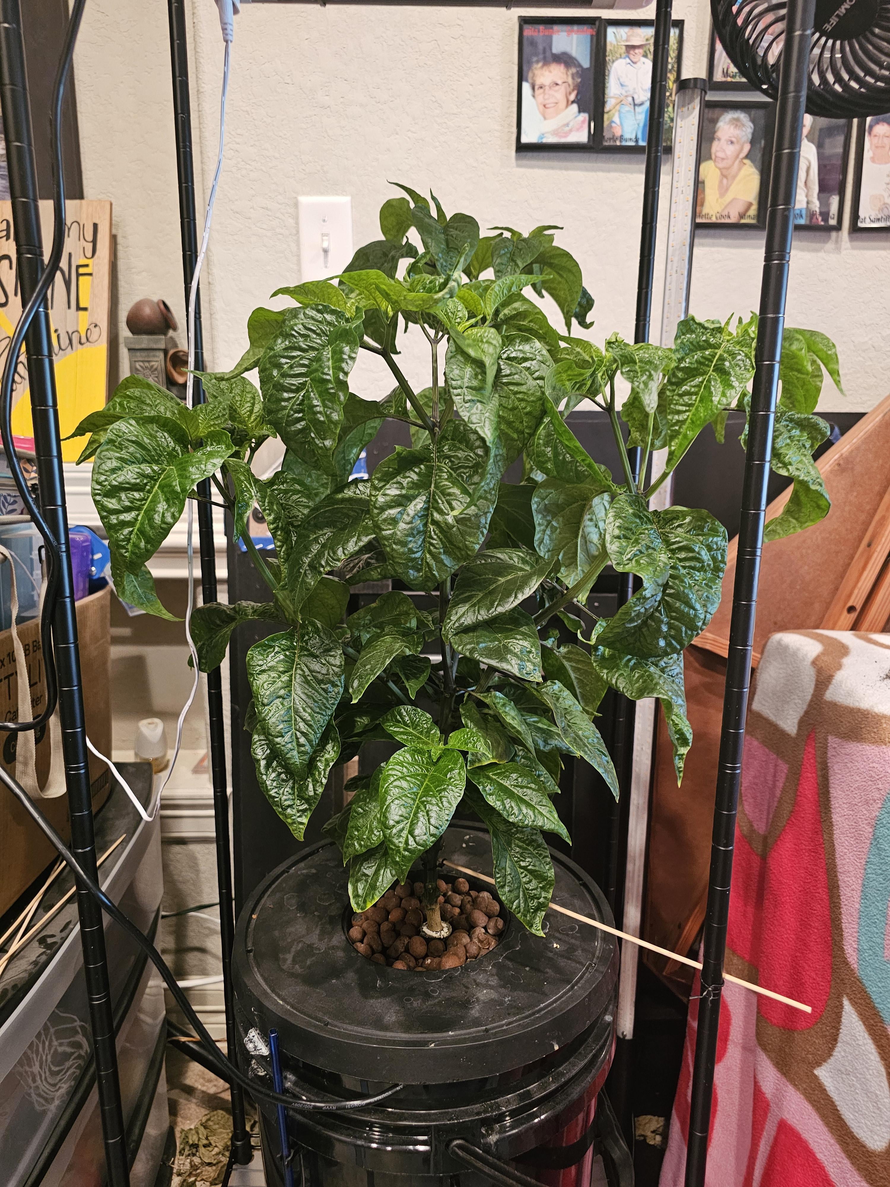 Anyone else grown Carolina Reapers in hydroponics? Started this one in Dec topped it at end of Jan and have been keeping it cleaned up…. i have plans for the future of this one but wanted to see what others think about it….its about 16in across, 20in tall, ½ inch on stem…. using A B for nutrients… 16/8 for light, and have side lights at ~9k lux with canopy ~27k lux… also an oscillating fan, 5g bucket with airstone inside…… im about to up it to a 12g soon…..