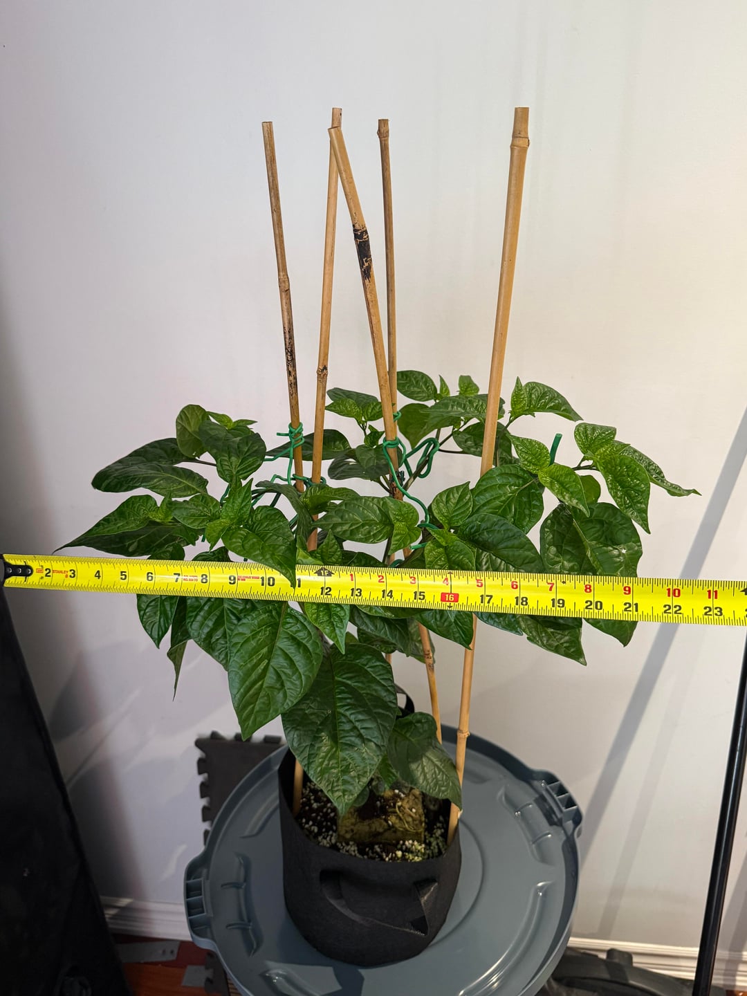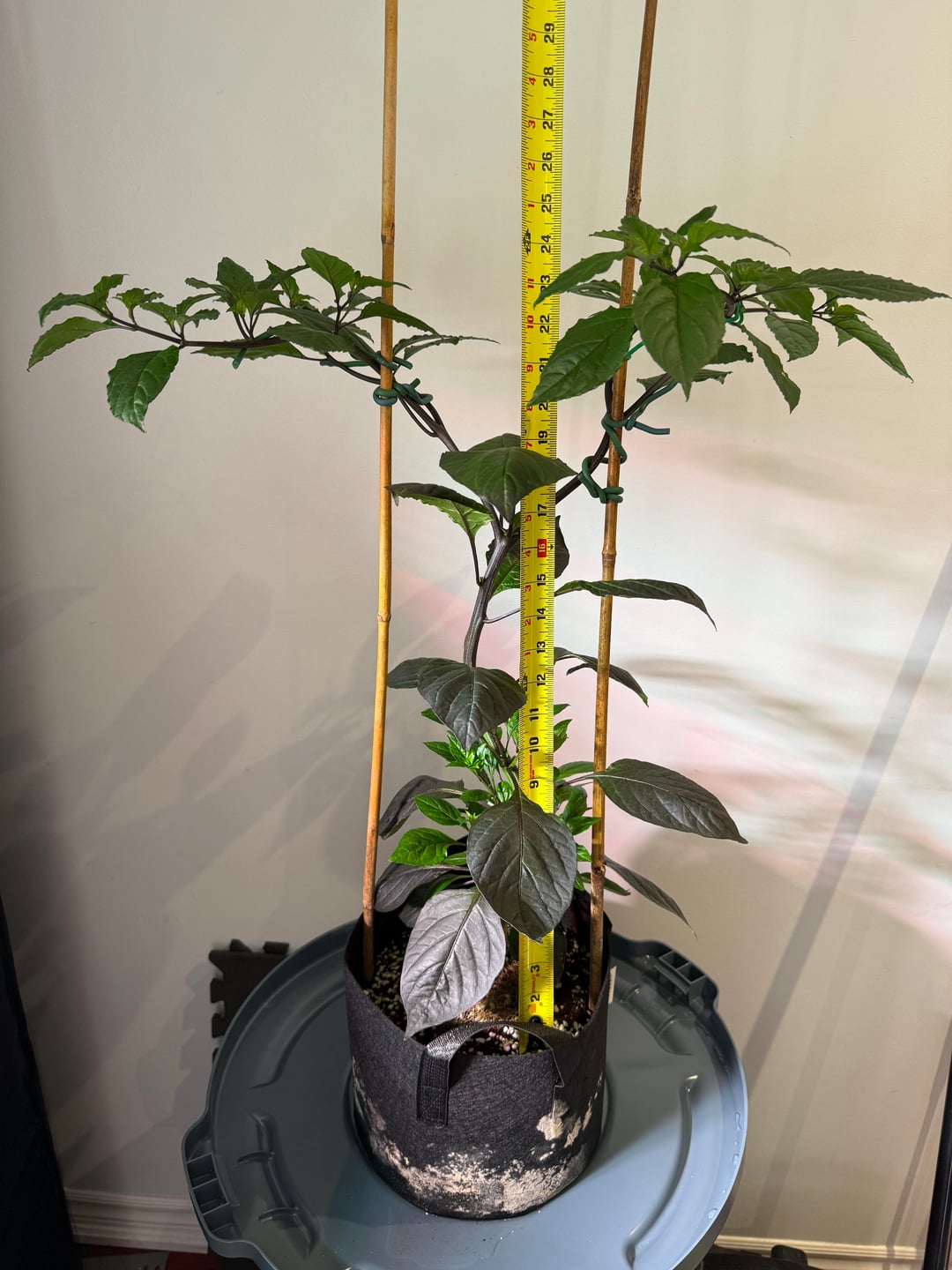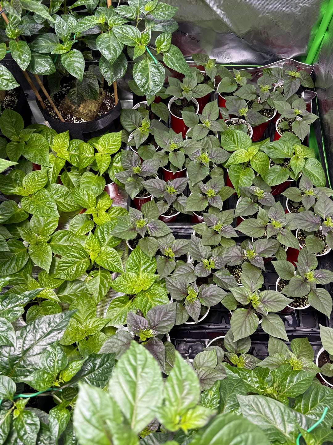 Ran out of room – sharing is caring. Dehumidifier working overtime. Roots in the party cup are almost ready, another week. Purple peach ghosts are catching up to the white habaneros and ghosts. Prepping 2 gal fabric pots for next week’s transplant. I did a root check this week on a 2 gallon plant and they are no where near ready for a transplant. Foliage to root ratios are interesting with peppers comparatively to other plants. Continuing to train laterally on the 12 I have in 2 gallons, up to 30 shoots on a few ghosts. Plans and ideas are constantly in a state of flux, the plants tell me what to do lol.