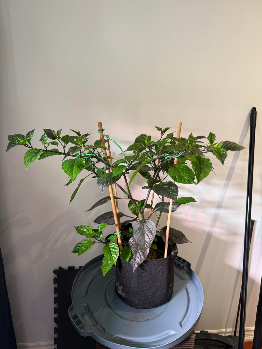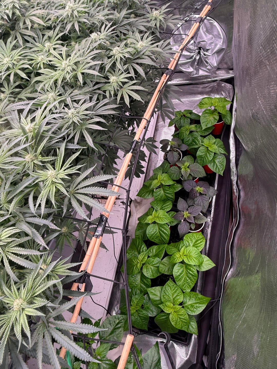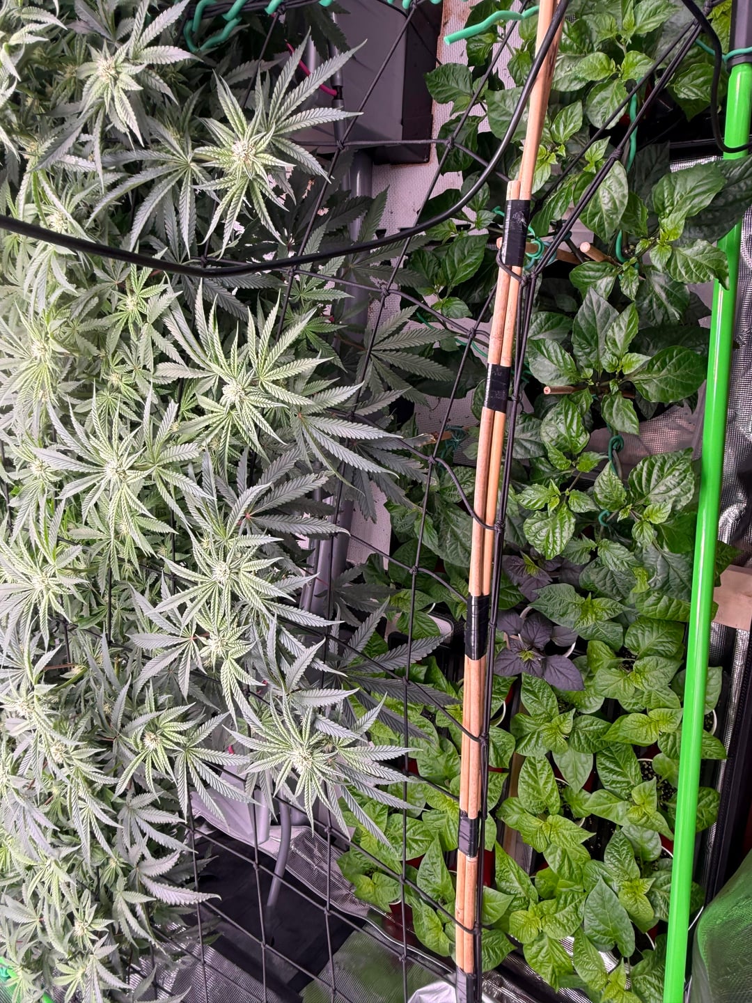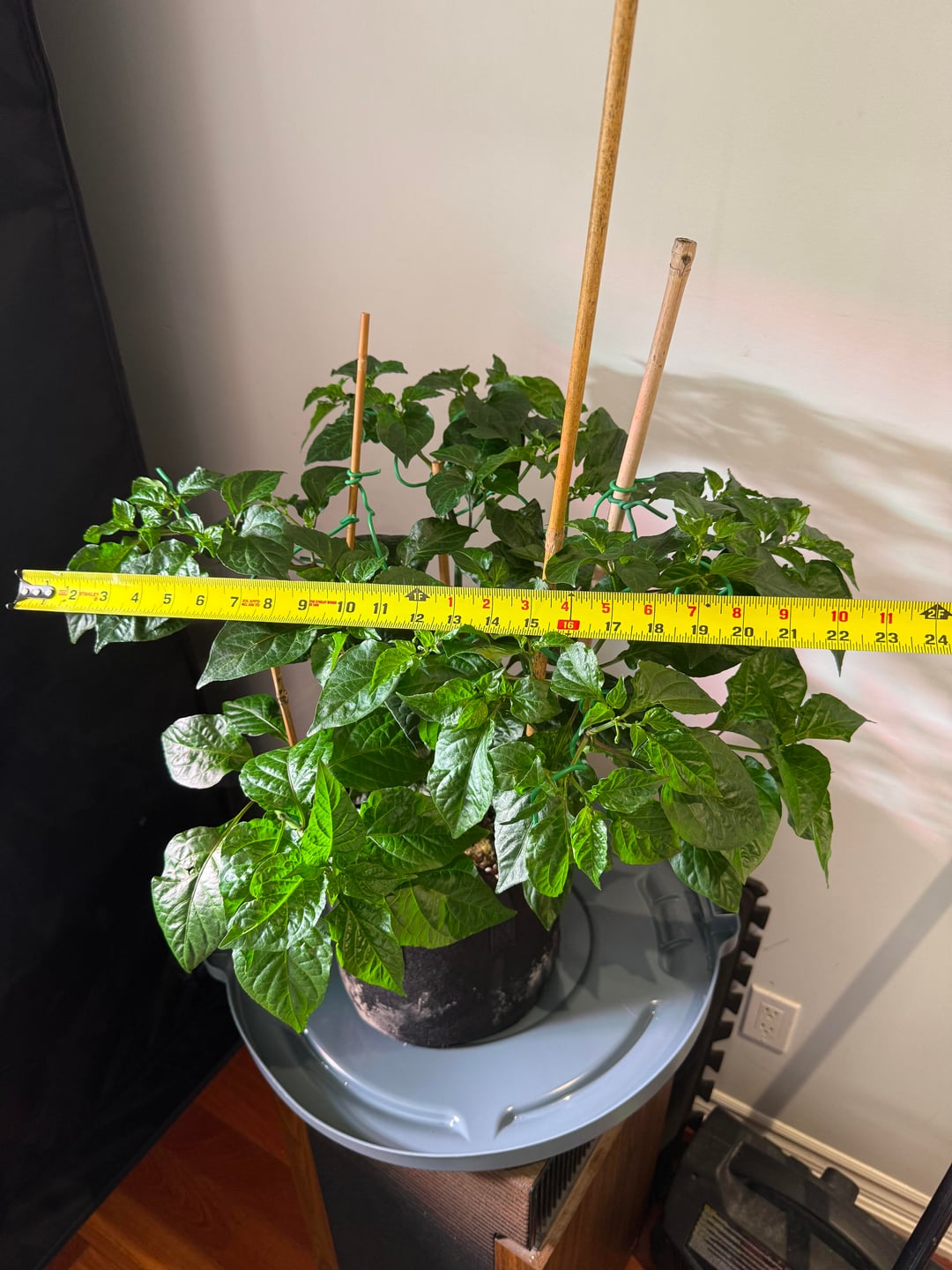 Ran out of room – sharing is caring. Dehumidifier working overtime. Roots in the party cup are almost ready, another week. Purple peach ghosts are catching up to the white habaneros and ghosts. Prepping 2 gal fabric pots for next week’s transplant. I did a root check this week on a 2 gallon plant and they are no where near ready for a transplant. Foliage to root ratios are interesting with peppers comparatively to other plants. Continuing to train laterally on the 12 I have in 2 gallons, up to 30 shoots on a few ghosts. Plans and ideas are constantly in a state of flux, the plants tell me what to do lol.
