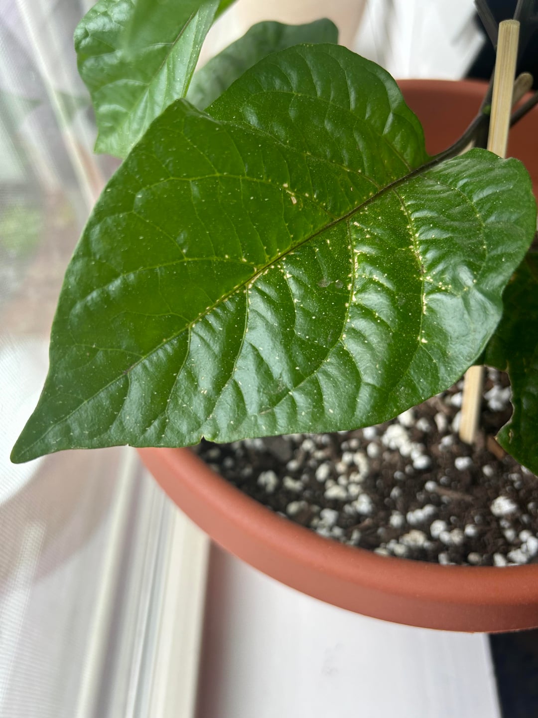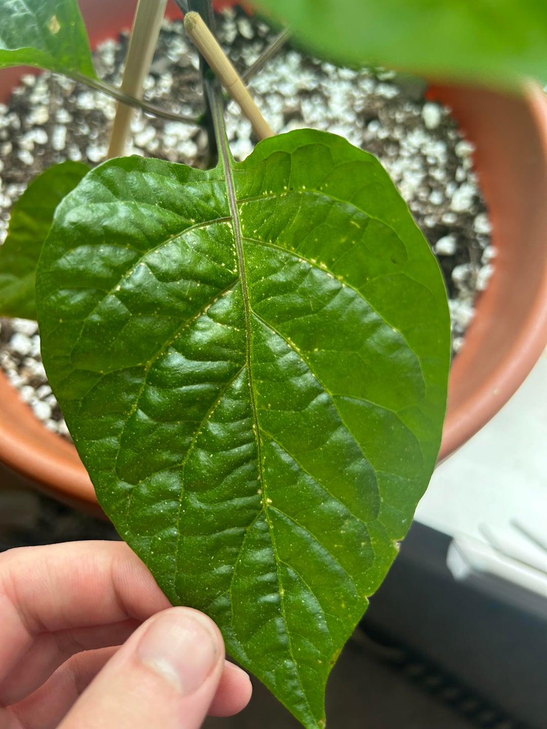 Hi all,I noticed these white dots appearing on the midrib and veins of my Trinidad moruga, any idea what this might be and do I need to do anything about it?Thanks!by EconomyGreek Hot peppersPeppersSpicy Stuffsweet peppers 1 Comment ShredTheMar 5 hours ago Looks like edema?Write A CommentYou must be logged in to post a comment.