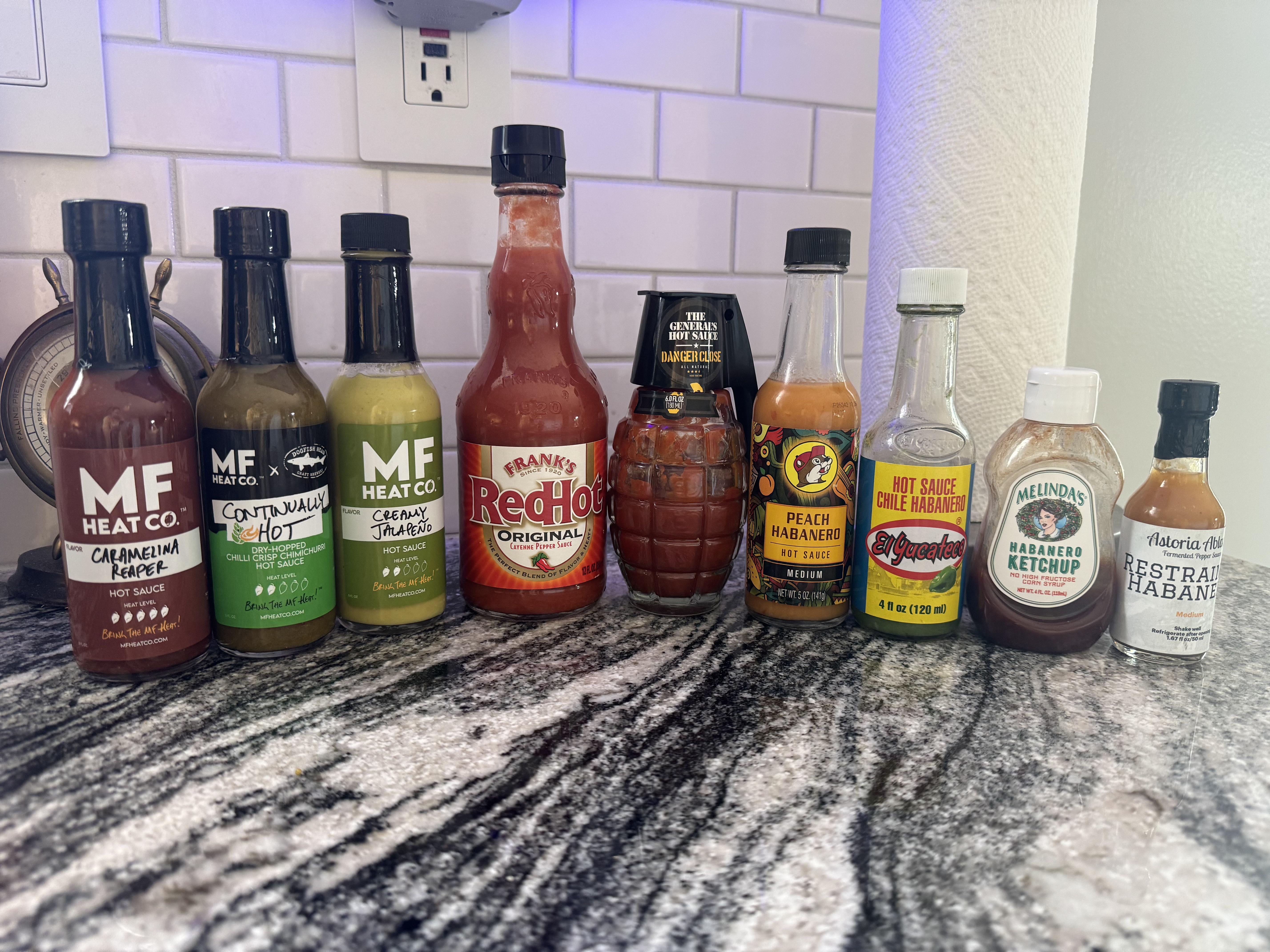 The others are the basic staples (husband likes Franks from time to time so we keep it around, not a hot sauce guy). Not a big fan myself of the Danger Close grenade sauce so I’m trying to work through it. Buc-ees sauce was just a novelty pick up. I should have selected hotter but it’s got good flavor.