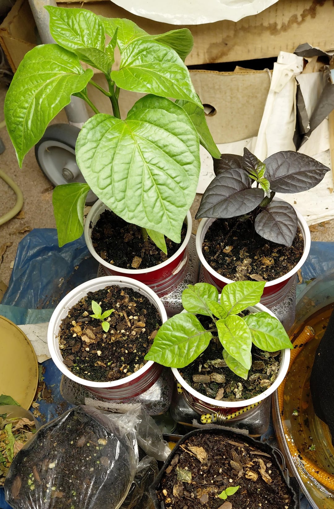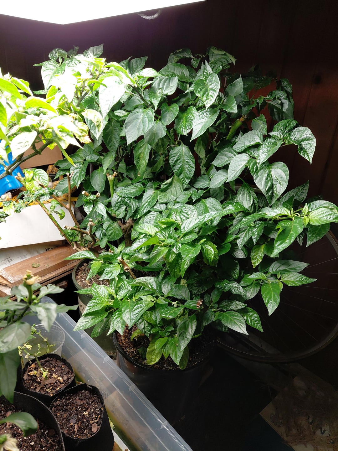 The two overwintered plants are Chocolate Scorpion and Caribbean Red Habanero, both in their 5th year! I trimmed them down to bare wood last fall – not one leaf was spared. This is the first time I've been that ruthless, but I did not have a single pest all winter. I just let them leaf out as the winter passed, and now they look incredible, even though they've been under minimal light. I'm debating whether to keep them next winter, but either way, they should have a great summer.