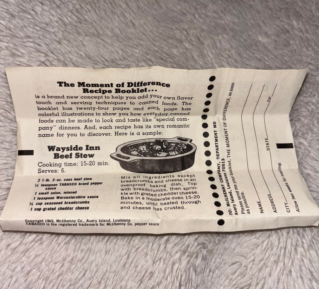 Unopened bottle of Tabasco in its original box that came with a recipe/order form! Found in my Grandma’s houseby isaidihatey0u hot sauceSauce 4 Comments copypop 2 hours ago  Complete_Entry 2 hours ago That recipe is some Grade A bachelor chow. Direlion 2 hours ago The packaging artwork is beautiful! _heyASSBUTT 2 hours ago Real talk… I’m assuming that would be edible?Write A CommentYou must be logged in to post a comment.