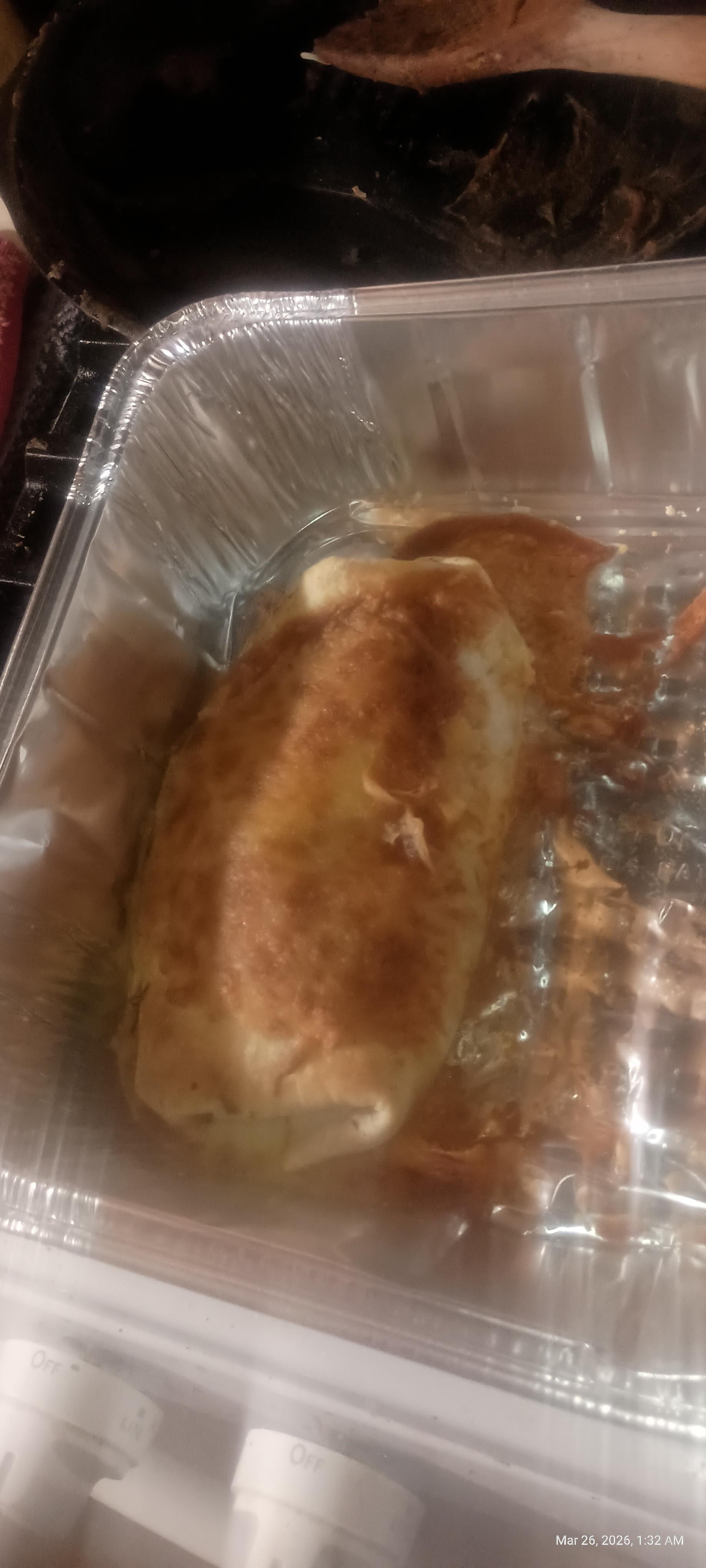 I know the picture is horrible, but it's the best I can do with the lighting I have. Okay, there's not much for lighting in a 1971 trailer. But this is the finished project; it's not fresh because I wasn't home when it got done. But when I got home, I realized it was way too spicy for my grandmother, but not for my other grandparents. But that's probably because they actually used the sour cream and lettuce I provided instead of just raw-dogging the food she knew was spicy. But apart from the overwhelming heat, it did taste like you just ordered this at a Mexican restaurant, and they did their job by making it Mexican by making it spicy.