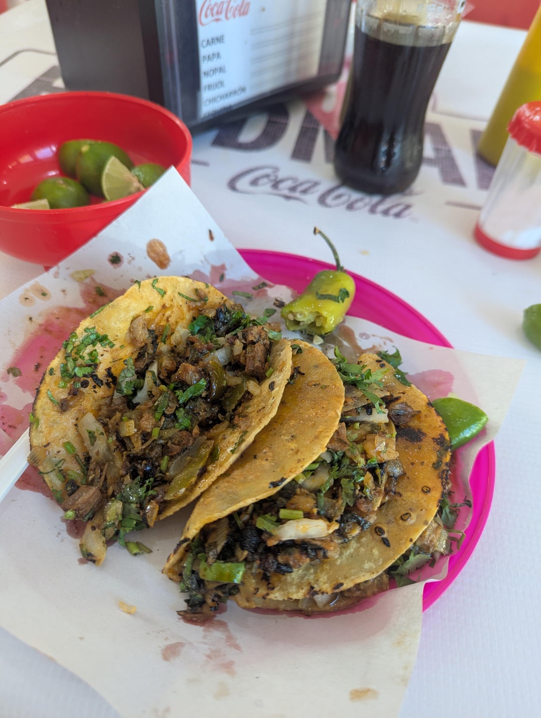 So, these are famous breakfast tacos in town. These are "esquina" (corner) tacos. They actually have chicharron, carne, nopal, beans, egg, and potato tacos. Esquina tacos are called that way because they're done from everything that builds up on the corner of the plancha, so it's crispy everything. The serrano is giving me a run for my money.