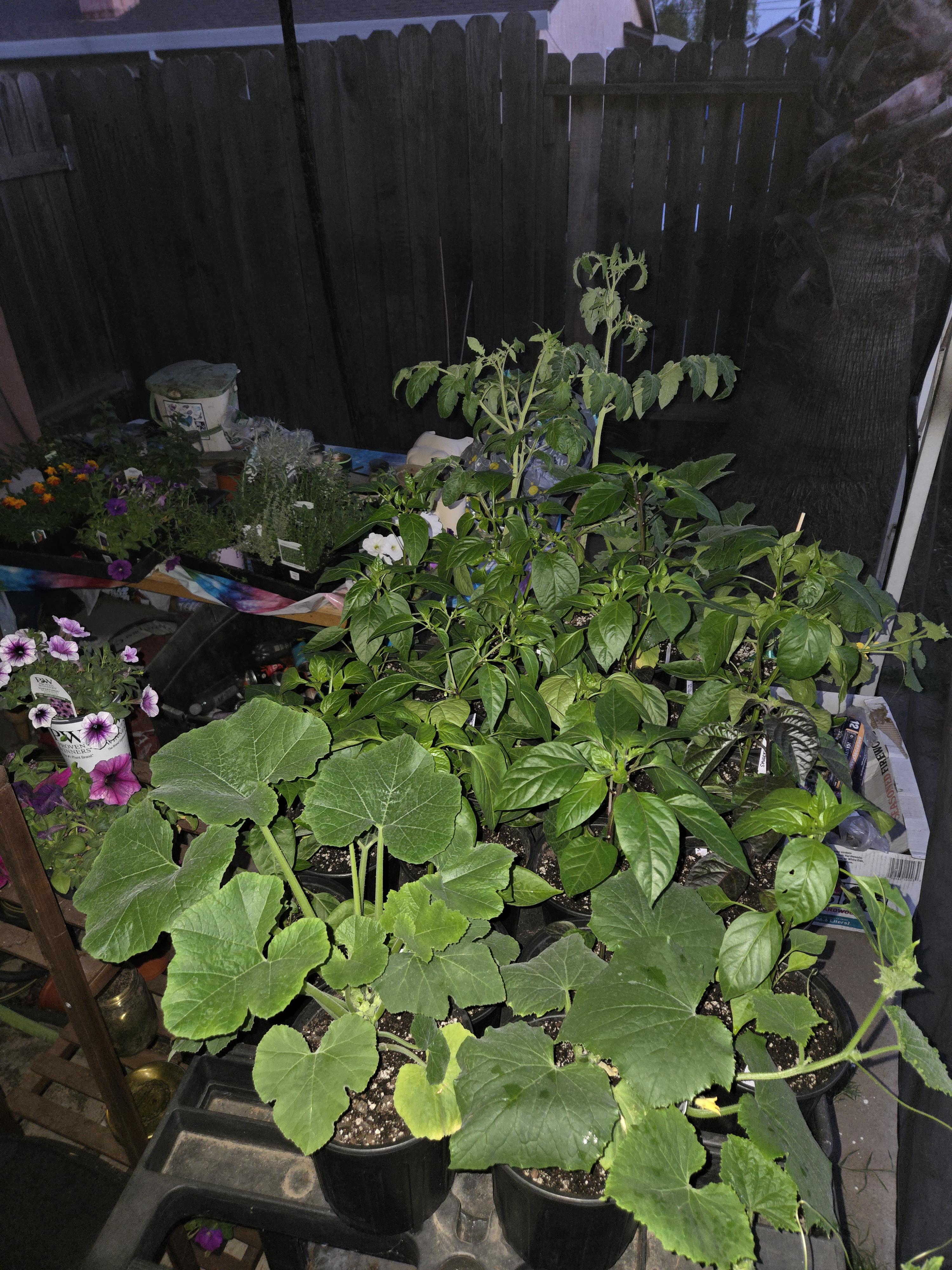 1st night out in the night. Been hardening off since Monday. Jimmy Nardello, Marconi Red Italian, Yatzufusa, Ring Of Fire, Sepia Reaper Nyde, Blushing Beauty and Sweet Crunch. Of course there's a couple of other plants but thats it for the hot.. and sweet peppers. Really excited about the Sepia Reaper Nyde. Also the Ring of Fire seeds were RED! Never seen that before š¤Æ