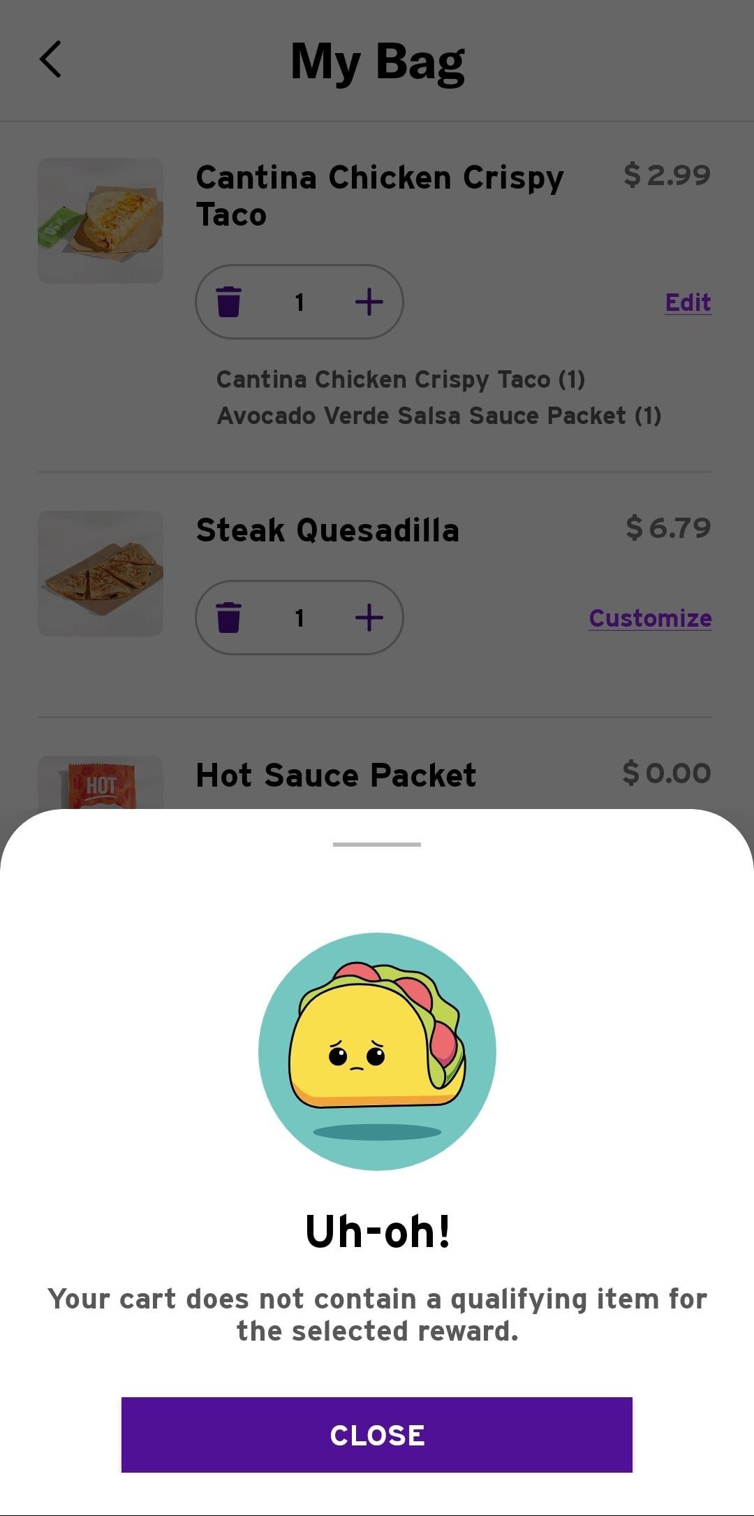 I can't figure out what I'm doing wrong. Has anyone gotten and successfully redeemed this reward? And yes, I do need the maximum sauce packet allowance by bellagab3 taco bell 1 Comment Chessie-kitten 3 hours ago Bring back the EnchiritoWrite A CommentYou must be logged in to post a comment.