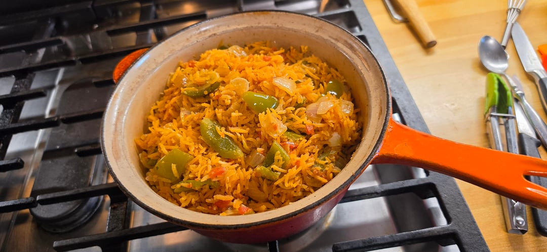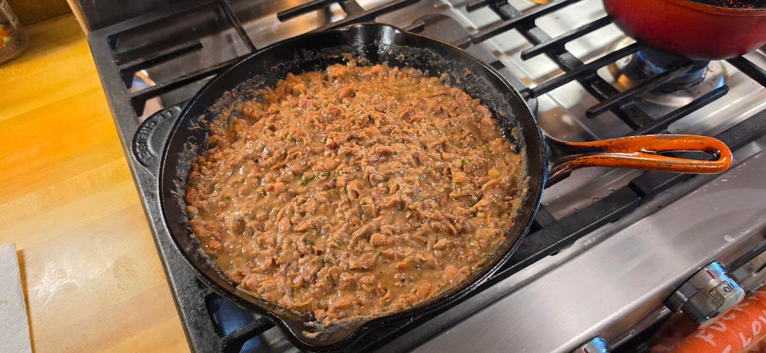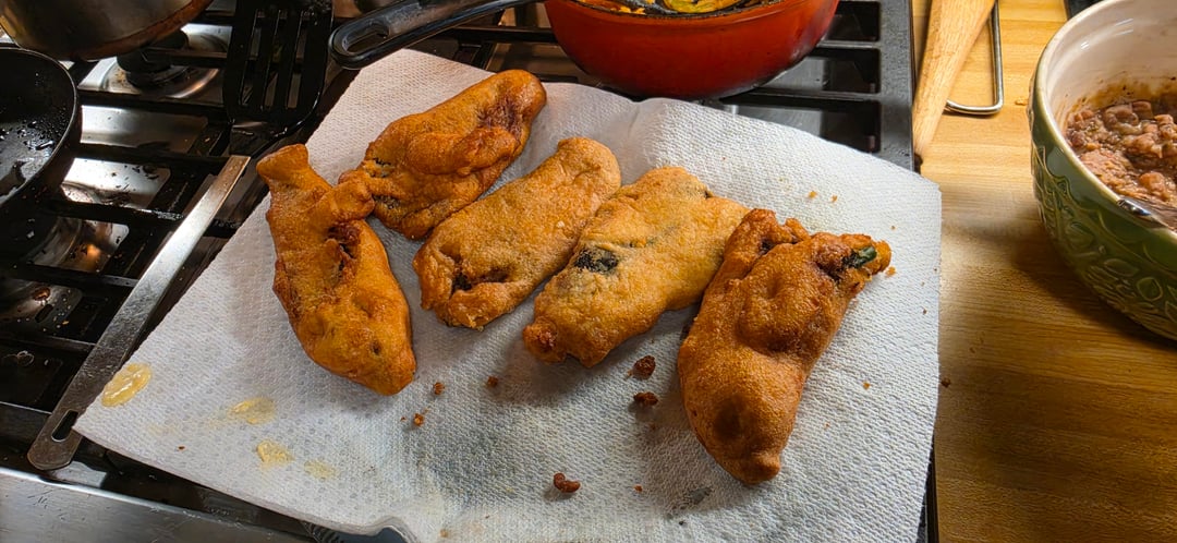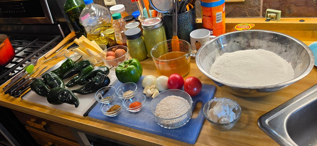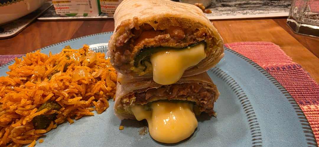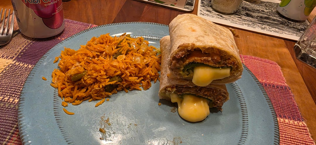 Tonight's dinner: Burritos de Chiles Rellenos y Arroz Mexicana. The burritos are from Jonathan Zaragoza. The rice is my abuelita's recipe. The charros are my dad's recipe.