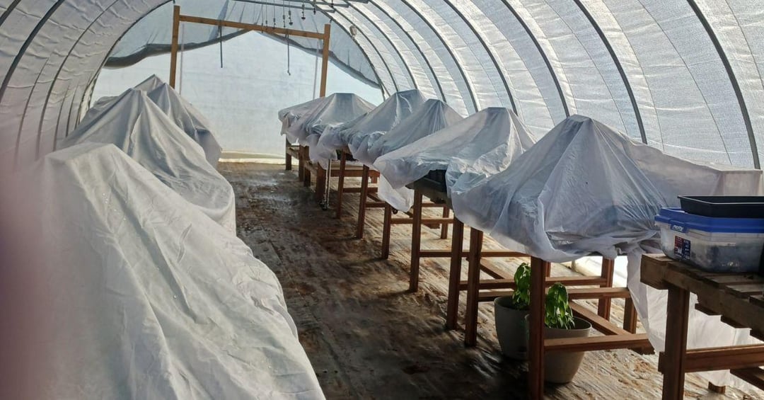 This was done on nursery seedlings but the concept applies exactly the same to plants in the ground or outside in containers. A single layer of row cover, sealed at the edges, buys you meaningful protection on nights when the forecast is flirting with freezing.