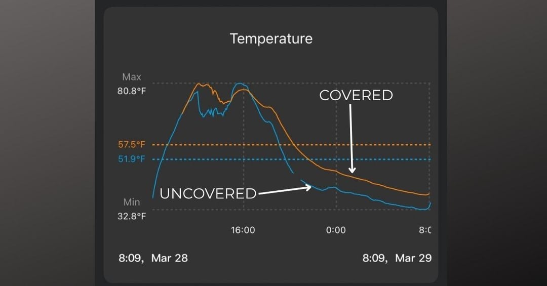 One thing worth knowing: a forecast of 34°F doesn't mean your plants see 34°F. On calm, clear nights the canopy can run 3–5°F colder than the official air temperature reading due to radiative heat loss. Apply your cover before dusk — not at midnight. The ground heat you're trying to trap is already gone by then.