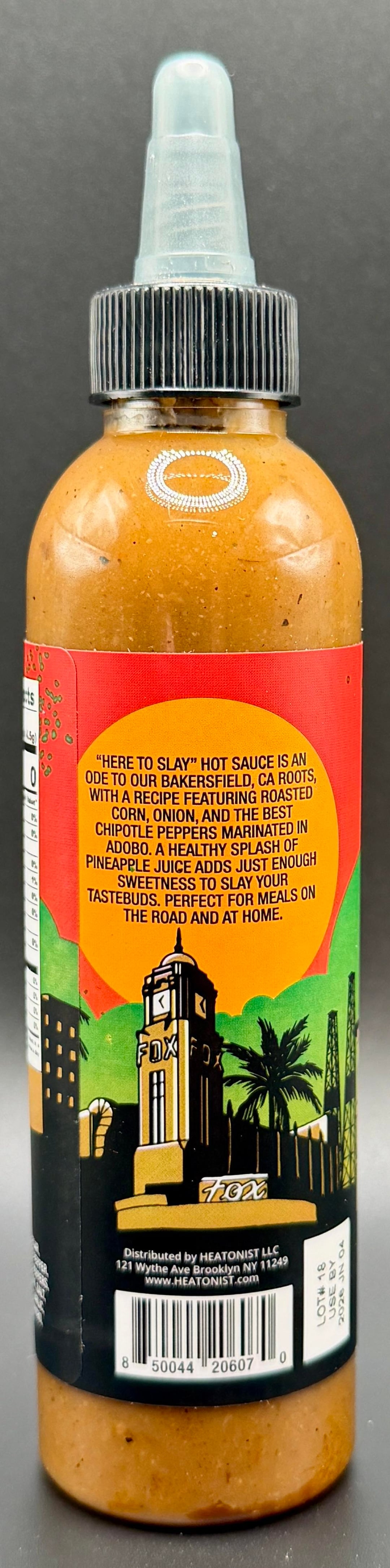 Here to Slay (a play off of the Korn song Here to Stay) starts off with onions and corn, which the back-label indicates is roasted. Heat comes from jalapenos, serranos, and chipotles in adobo. Adobo is interesting in that it means very different things in different cultures and even means different things in different contexts within Mexico. It can be a dried-chile based sauce used to cook meats or poultry or, as it is in this case, it can a tomato-based sauce with aromatics and acid that both adds flavor to the chipotle peppers and absorbs some of the smoky flavor from them. Spices and aromatics you expect to see in Mexican inspired sauces such as cilantro, cumin, and garlic fill out the ingredients list along with some pineapple for sweetness, which is also a common ingredient in al pastor tacos. This sauce also uses some lime juice for additional acidity and canola oil to help give the sauce an emulsified consistency. Here to Slay is creamy and medium-thick, perhaps a little looser than mayonnaise. You can see some small bits of spices and vegetables in the sauce and the aroma of the corn, aromatics, and peppers comes through.