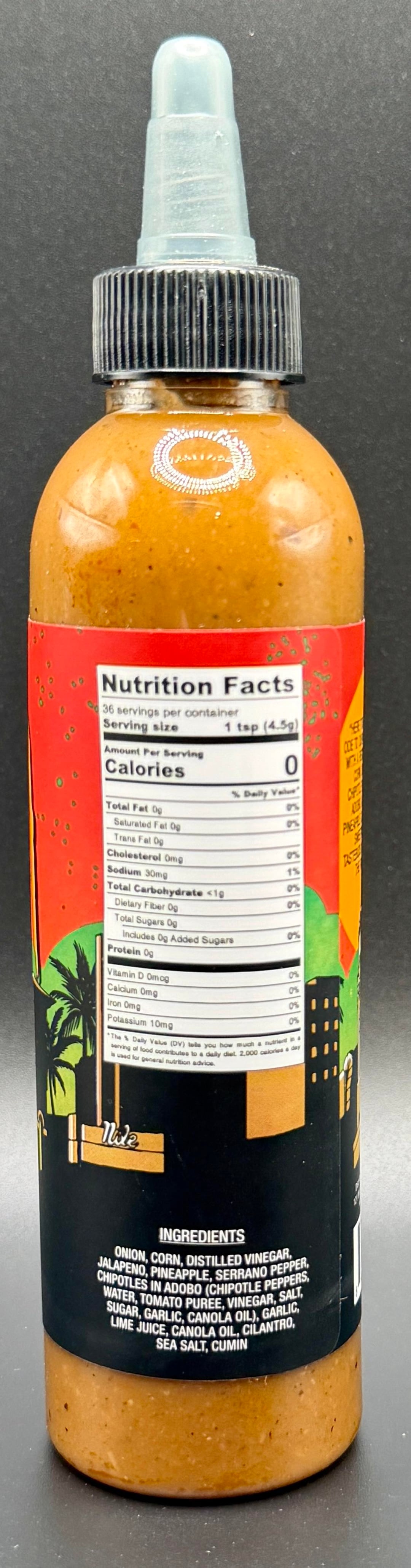 Ingredients: Onion, corn, distilled vinegar, jalapeno, pineapple, serrano pepper, chipotles in adobo (chipotle peppers, water, tomato puree, vinegar, salt, sugar, garlic, canola oil), garlic, lime juice, canola oil, cilantro, sea salt, cumin