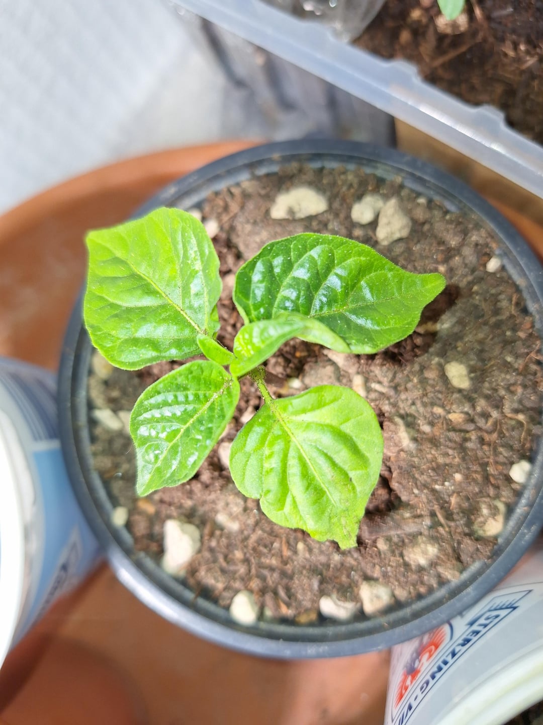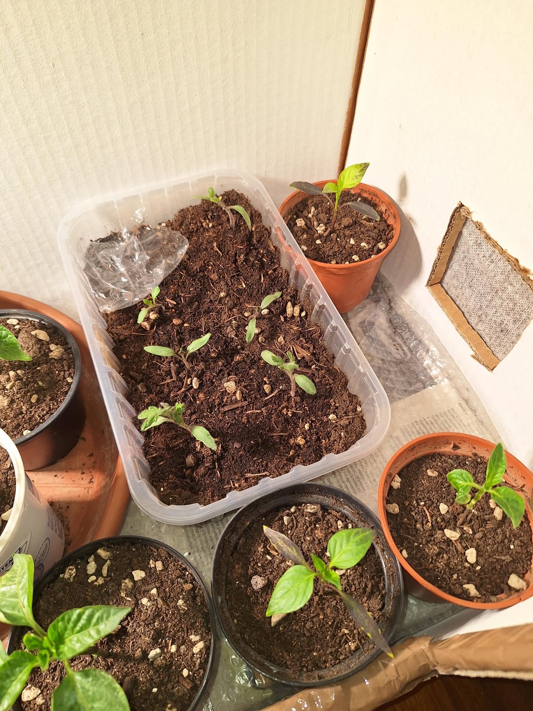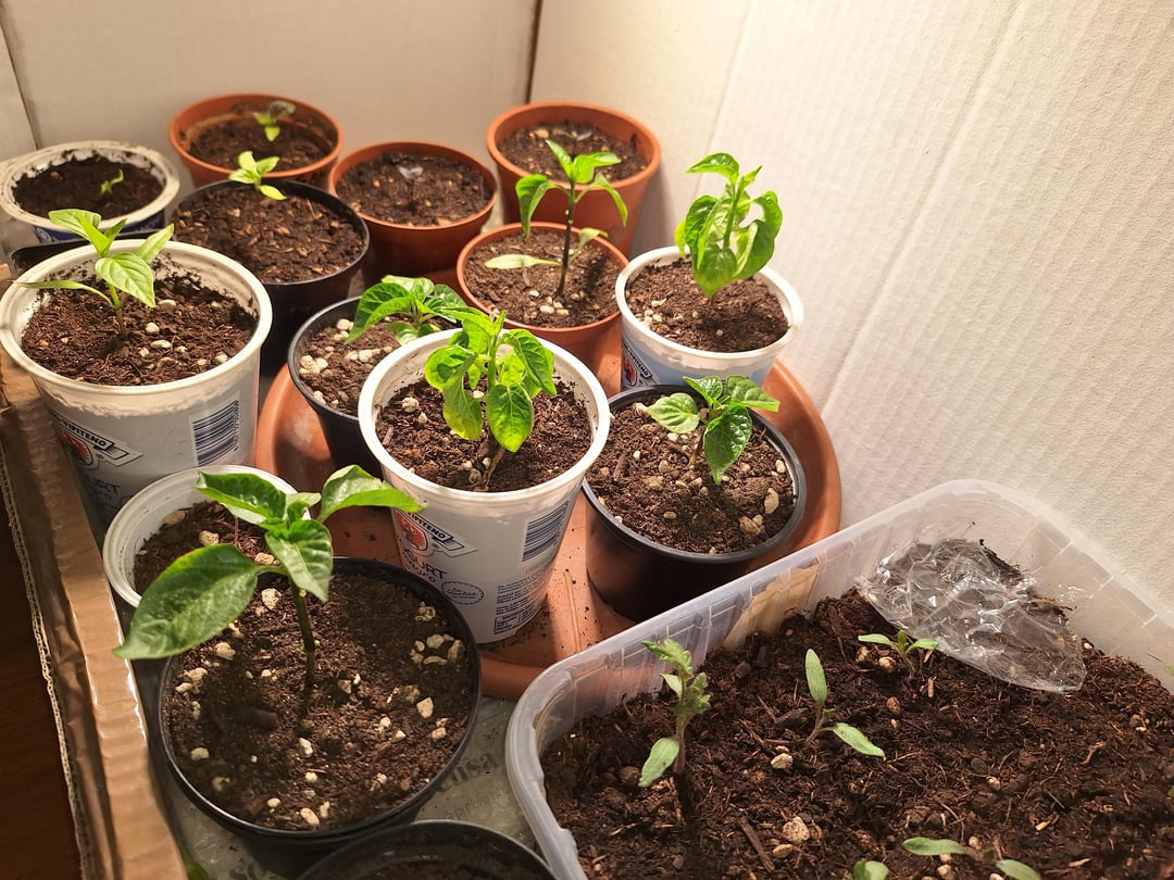 This is my set of: habanero mustard, aji lemon, pink tiger, sugar rush stripey, round calabrese pepper, bull horn and froggitelli peppers (all recently moved in bigger containers).