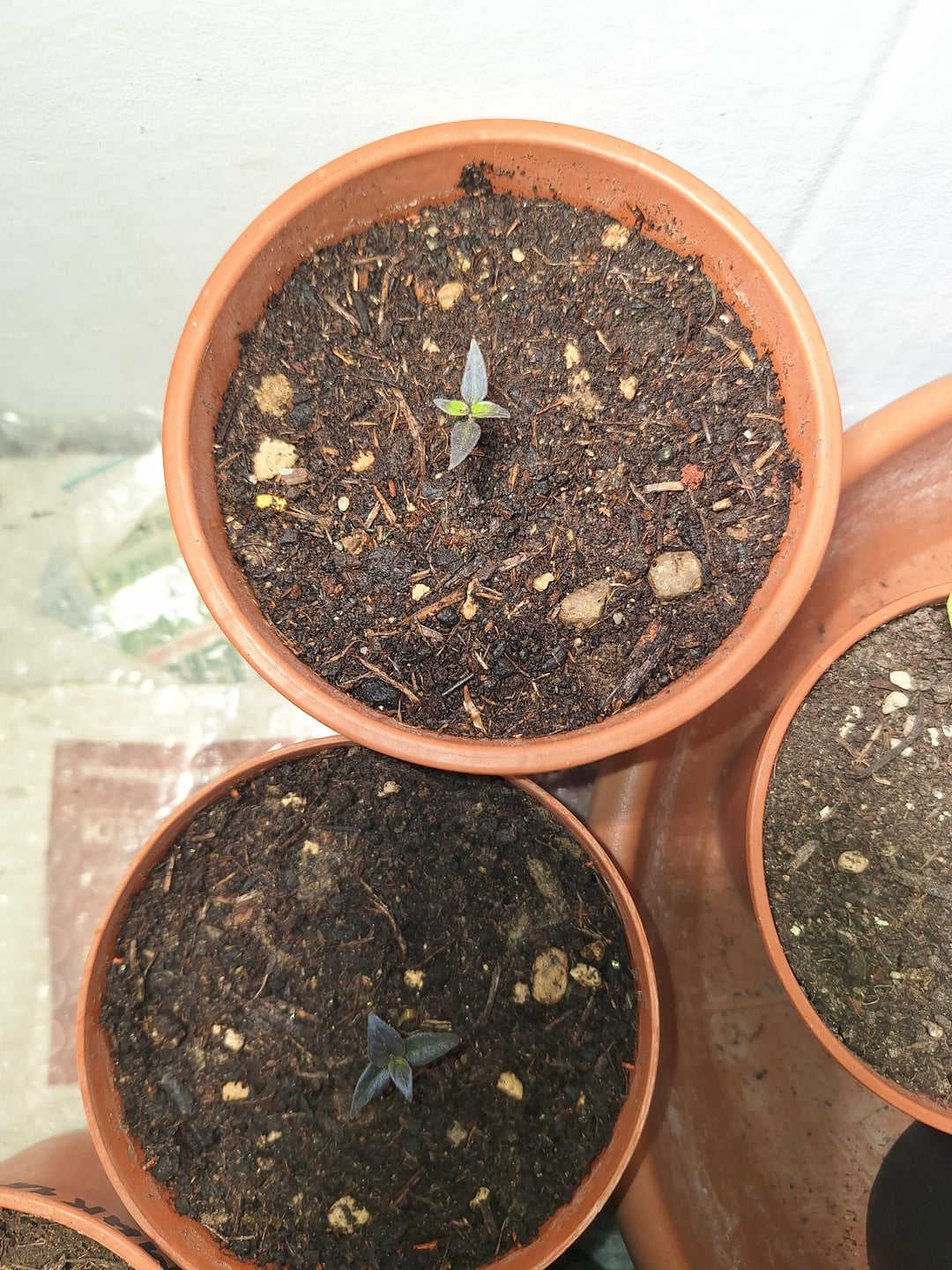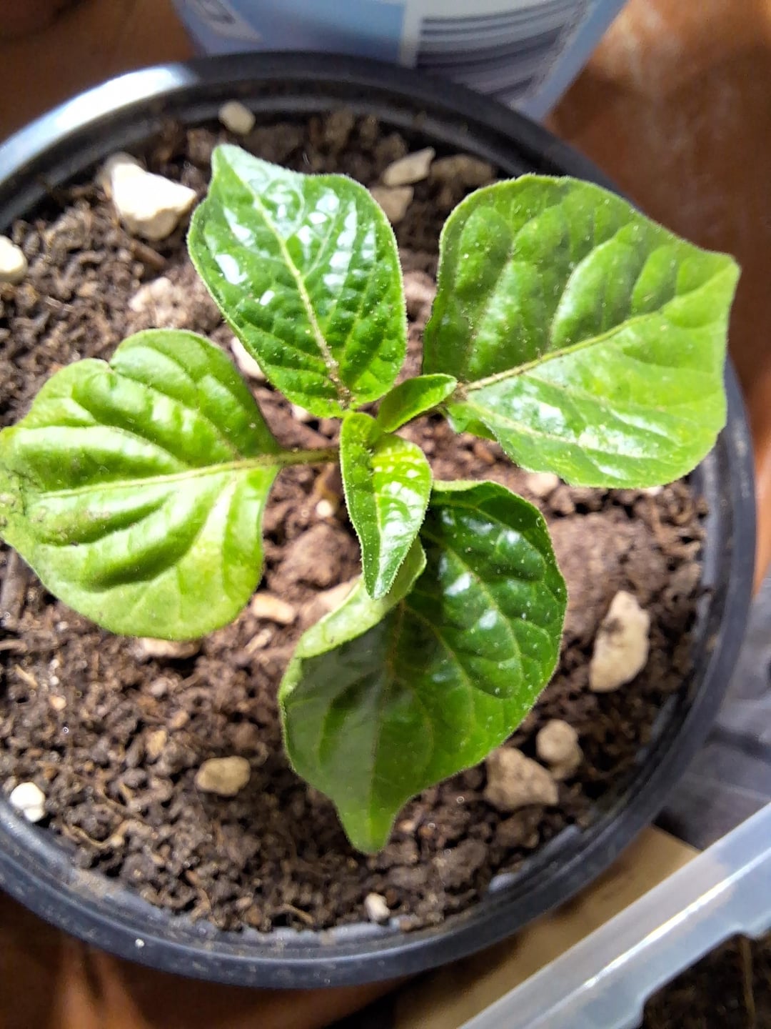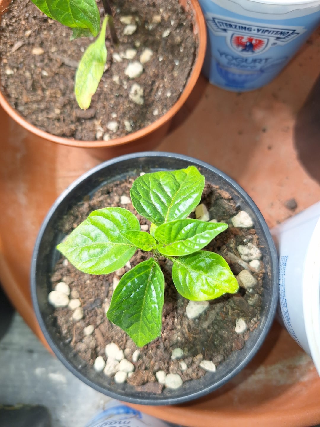 This is my set of: habanero mustard, aji lemon, pink tiger, sugar rush stripey, round calabrese pepper, bull horn and froggitelli peppers (all recently moved in bigger containers).