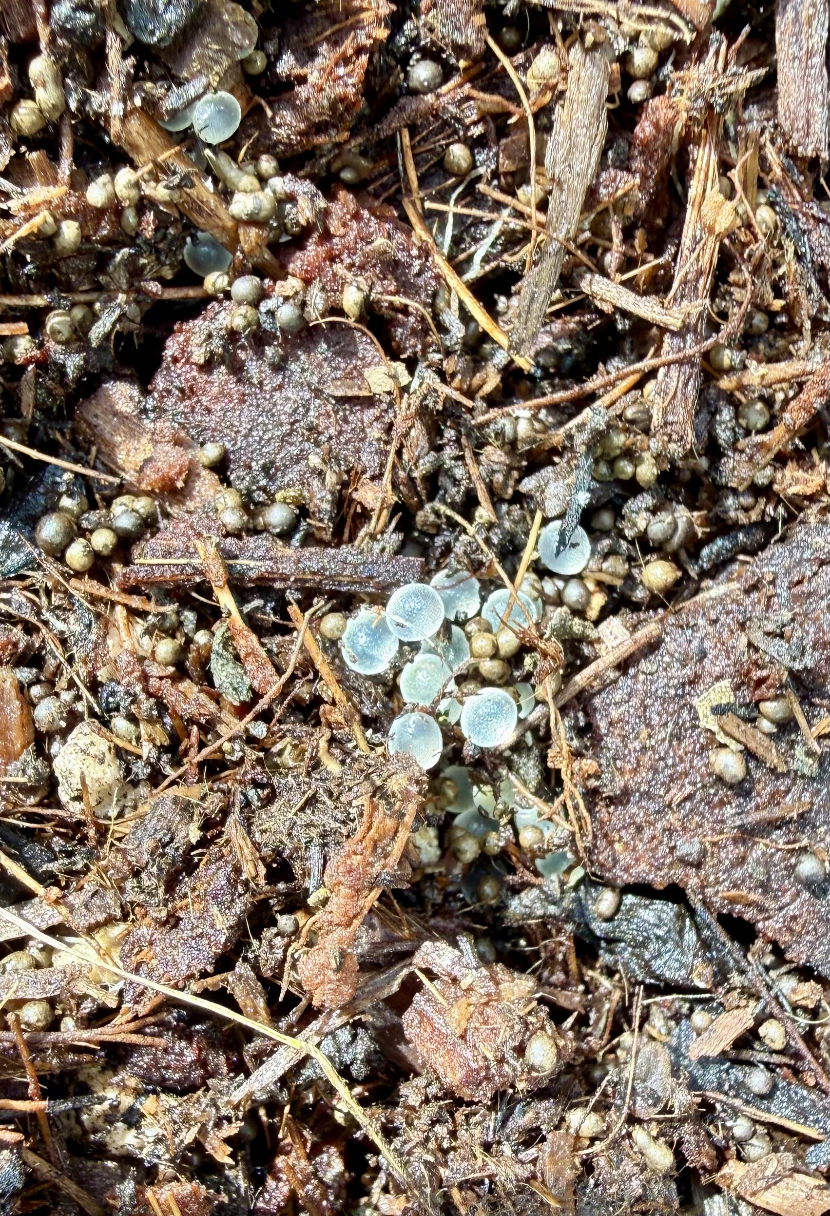 Getting my barrels and planters ready for the season. As I was removing the coco coir mulch I saw these spheres between the mulch and soil layer. Both the small clump of clear spheres and the small brown ones that were more wide spread. Better pic of the brown spheres [here](https://i.imgur.com/NruEONT.jpeg). I don’t remember seeing anything like this prior, and have not seen them in other planters.