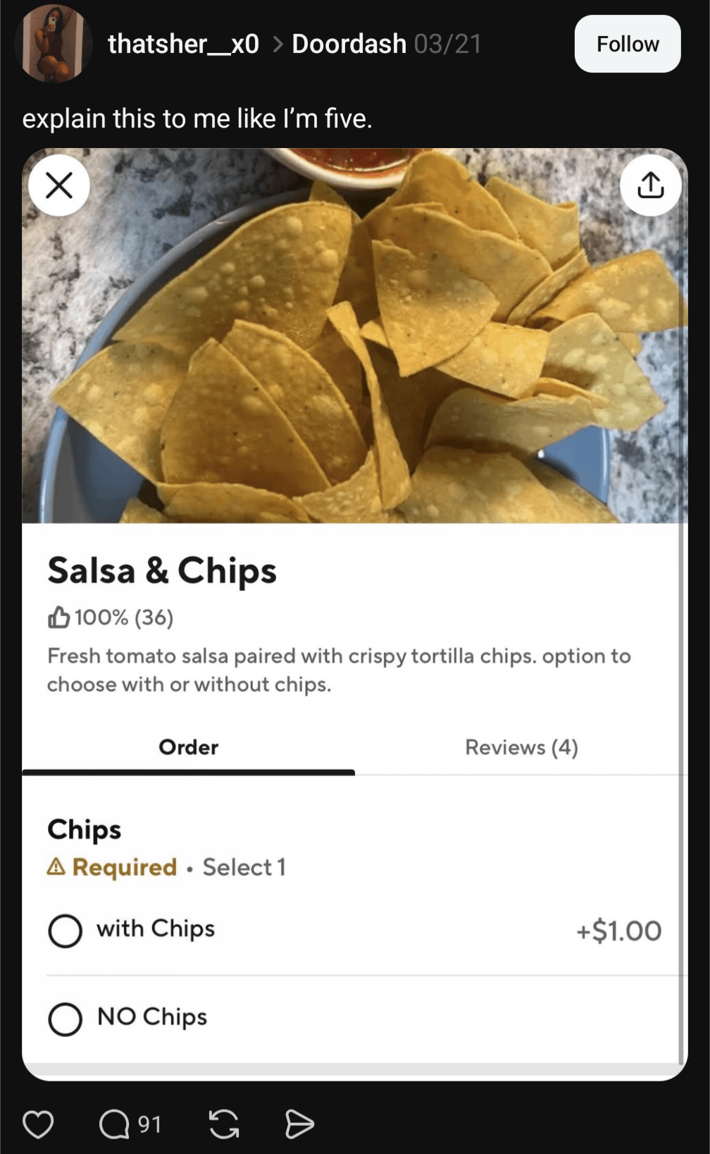 Doordash – salsa & chips, with chips or no chipsby exgaysurvivordan pico de gallosalsaSauceWrite A CommentYou must be logged in to post a comment.