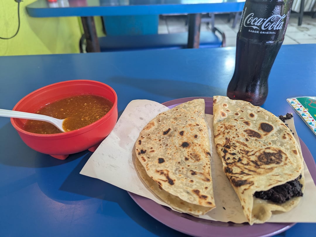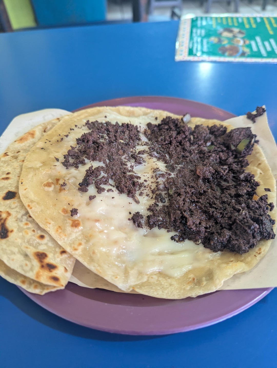Chicharron prensado en salsa verde and morcilla breakfast flour quesadillas. That's a mouthful. Wanna know what morcilla is? It sounds kinda gross but its delish. It's cooked blood with chiles, spices, etc.